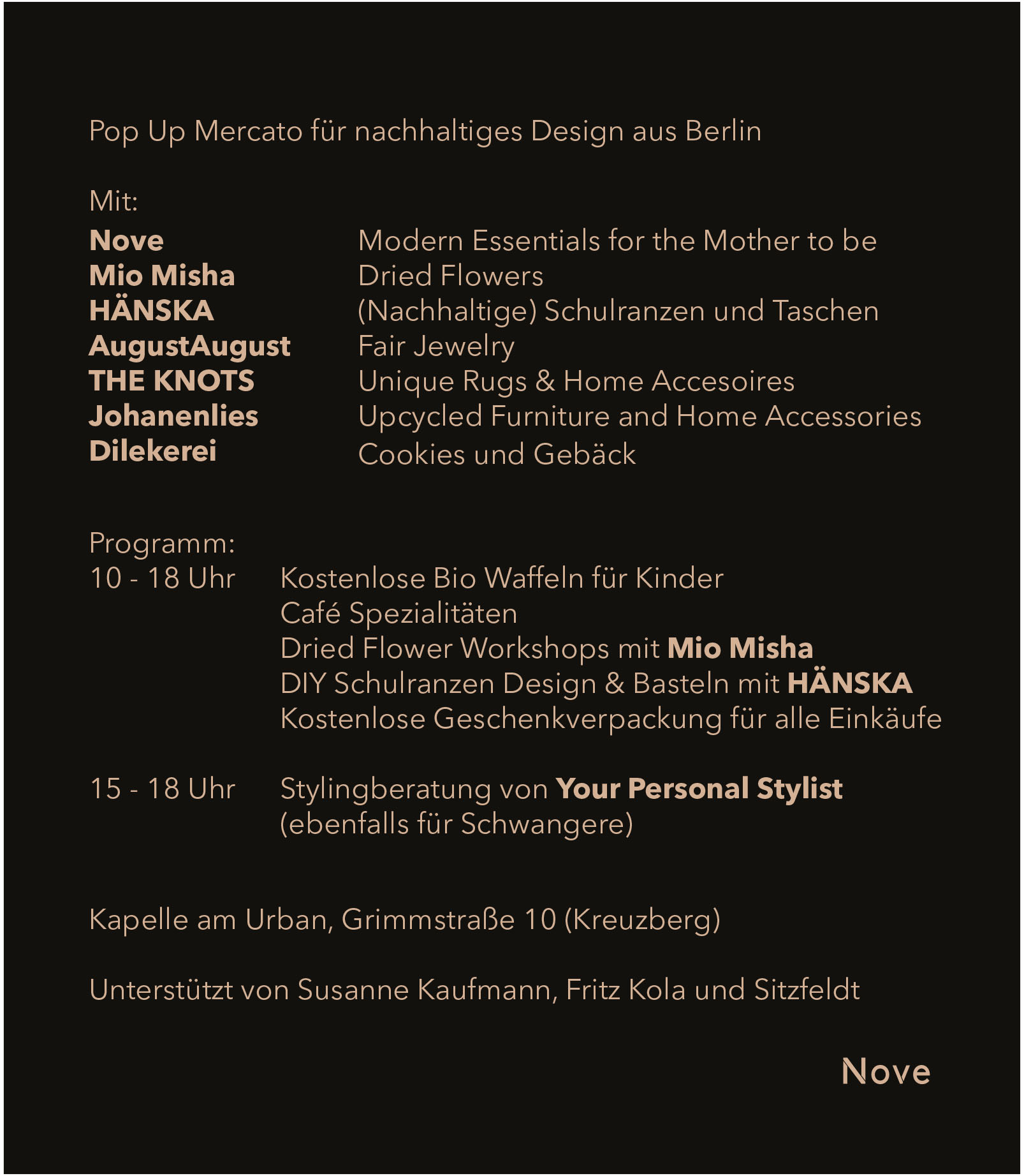 Am 14. Dezember findet der Pop-up Christmas Mercato für nachhaltiges Design aus Berlin statt. Mit dabei sind etwa das Schmucklabel AugustAugust, das Teppich- und Home Accessoire-Label The Knots sowie die Bekleidungsmarke Nove. Und das Beste? Während ihr nach neuen Lieblingsstücken stöbert, könnt ihr es euch bei Leckereien von Dilekerei gutgehen lassen.