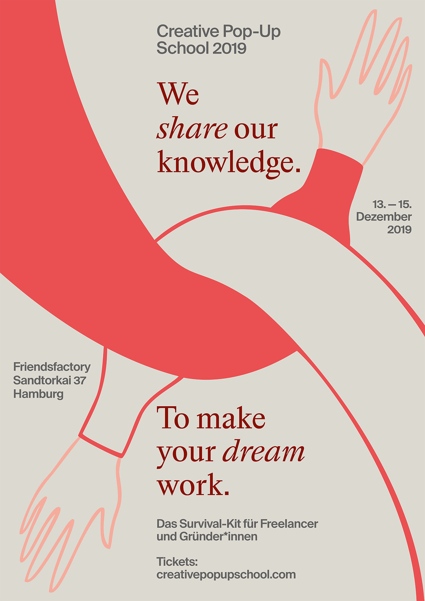 Hamburger*innen aufgepasst: Vom 13. bis zum 15. Dezember findet die Creative Pop-Up School für Freelancer*innen und Gründer*innen statt. An drei Tagen finden hier Panel Talks und Workshops rund um die Themen Finanzierung, Gründung, Design, Marketing, Social Media und Kreativität statt. Zu den Speaker*innen zählen etwa Cloudy Zakrocki (Refinery29) und Christiane Bördner (The Gaabs). Weitere Infos und Tickets findet ihr hier.
