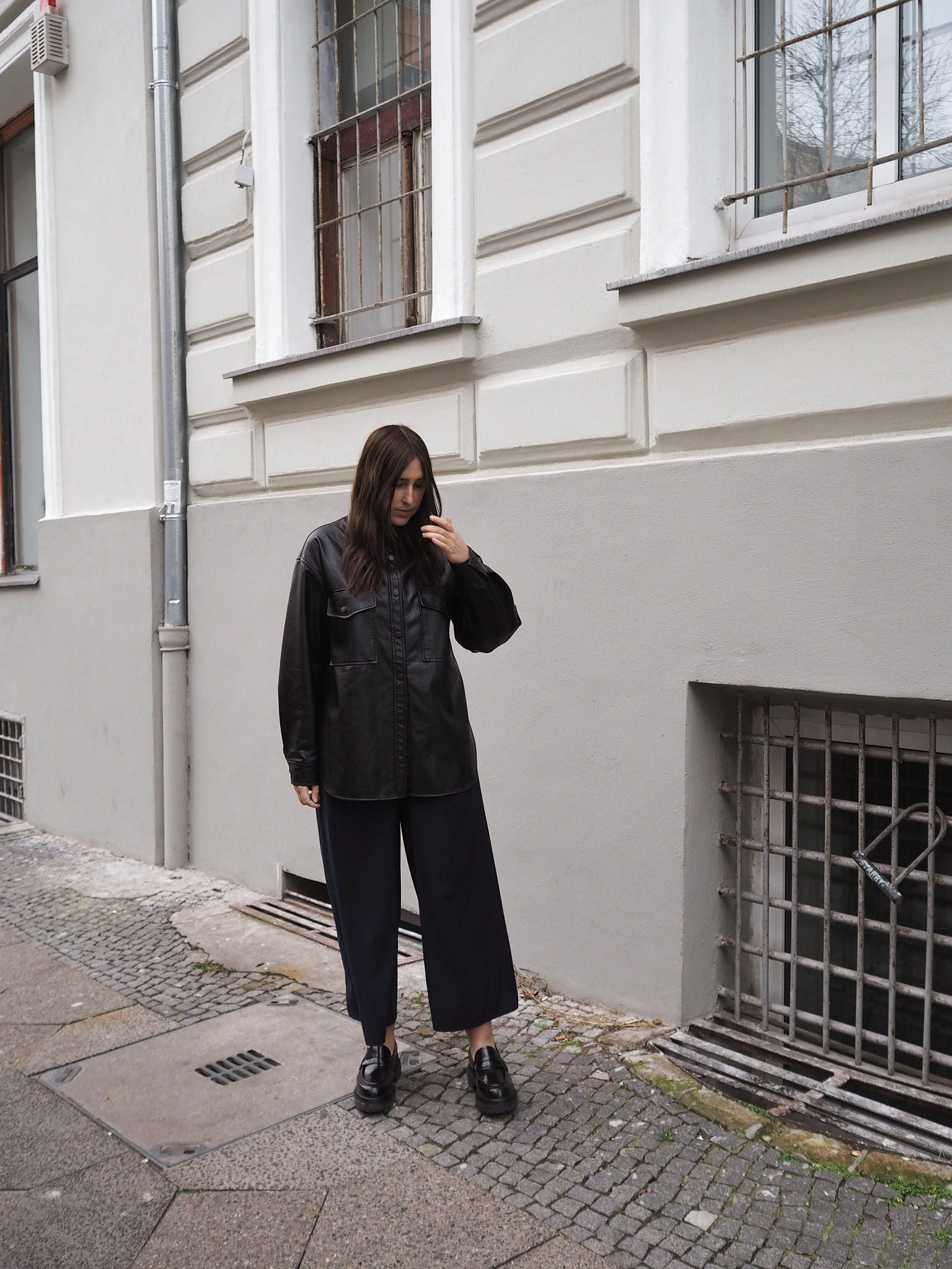 Shirt aus veganem Leder von Pixiemarket, Hose von Keepsake (alt), Schuhe von MM6 Maison Margiela