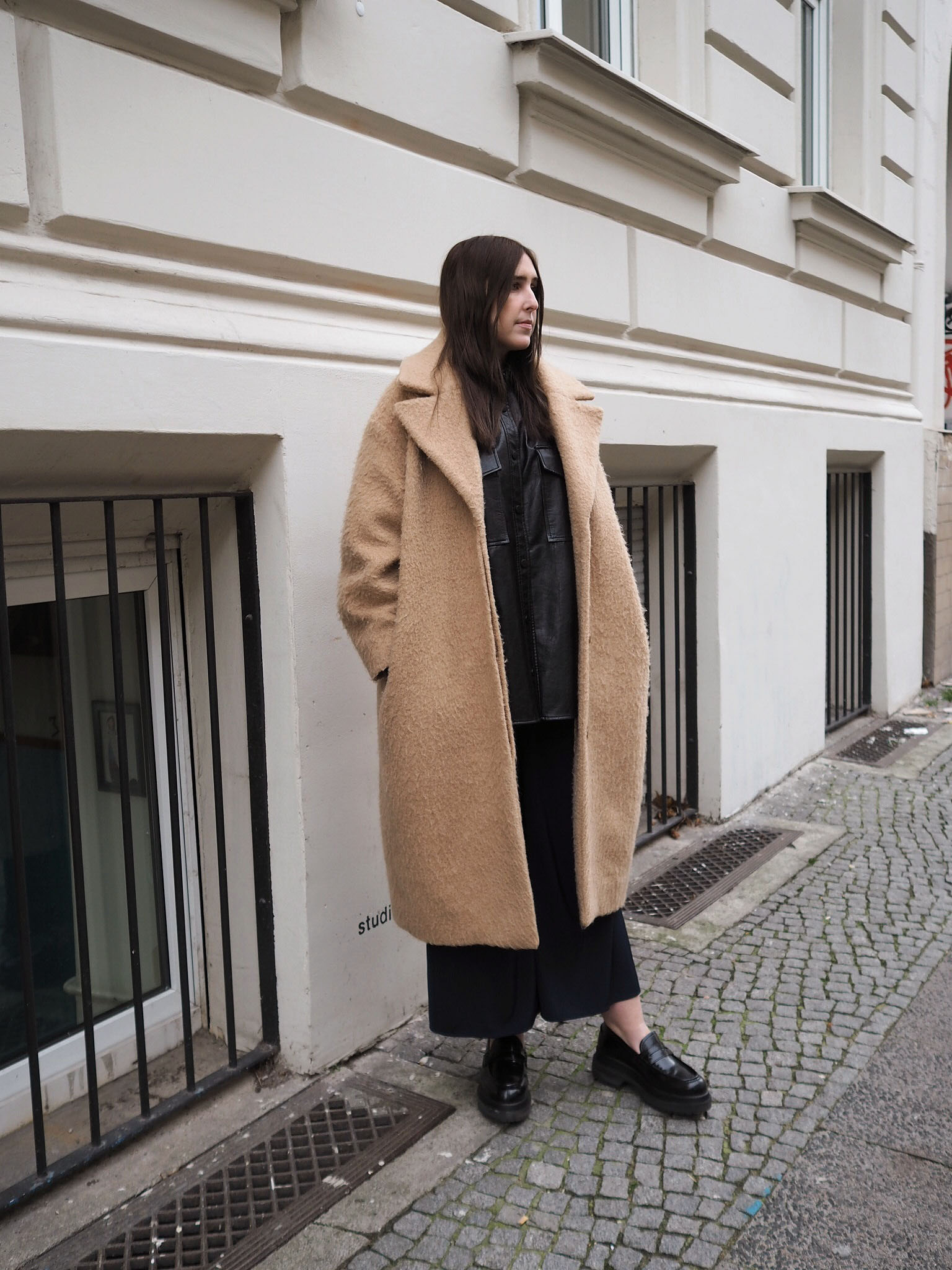 Mantel von Weekday (alt), Shirt aus veganem Leder von Pixiemarket, Hose von Keepsake (alt), Schuhe von MM6 Maison Margiela