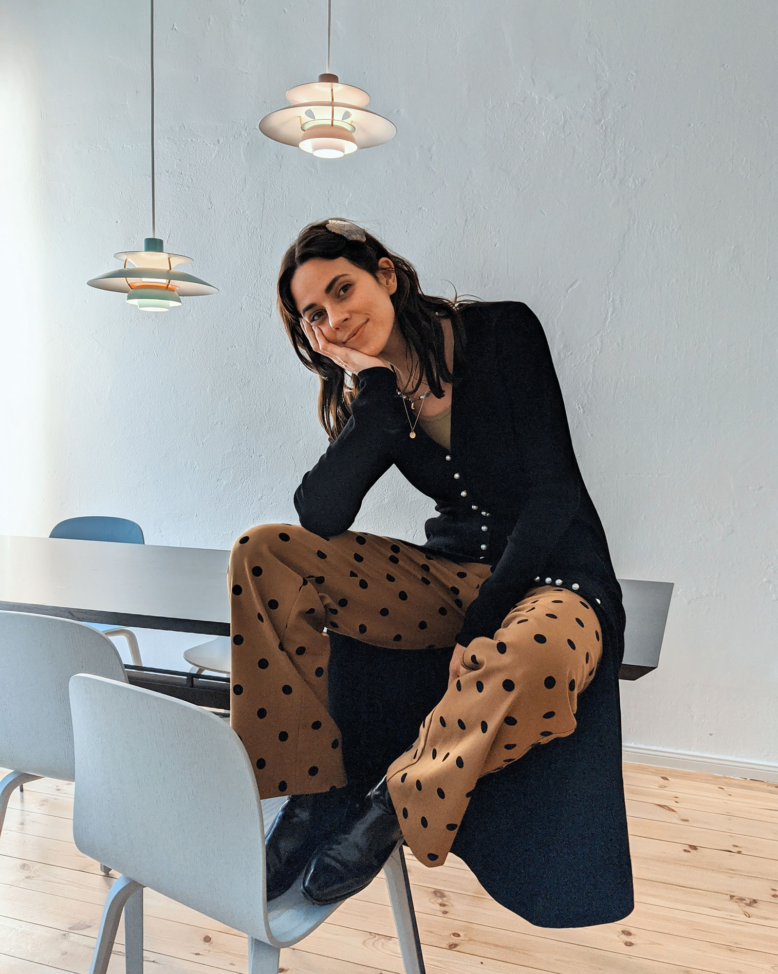 Muschel-Haarspange: KDG x Jane Wayne, bunte Kette: KDG x Jane Wayne, goldene Kette: Jane Kønig, Cardigan: & other stories, Hose: Stine Goya,, Boots: Prada