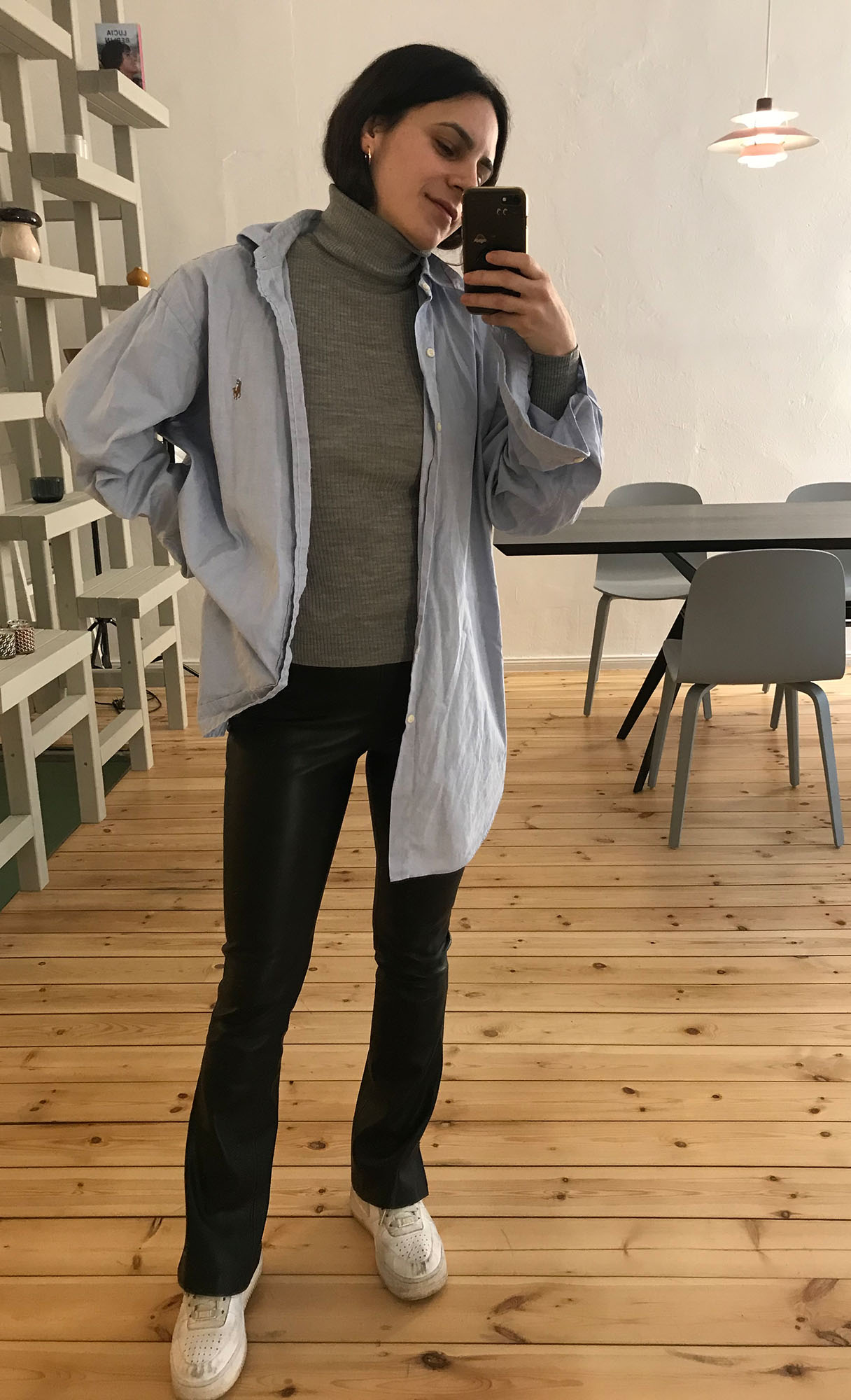 Hemd von Ralph Lauren Secondhand (ähnlich hier), Rollkragen Pullover von Uniqlo, Lederhose von Mango (alt, ich finde keine ähnliche aaaah), Schuhe Nike AF1