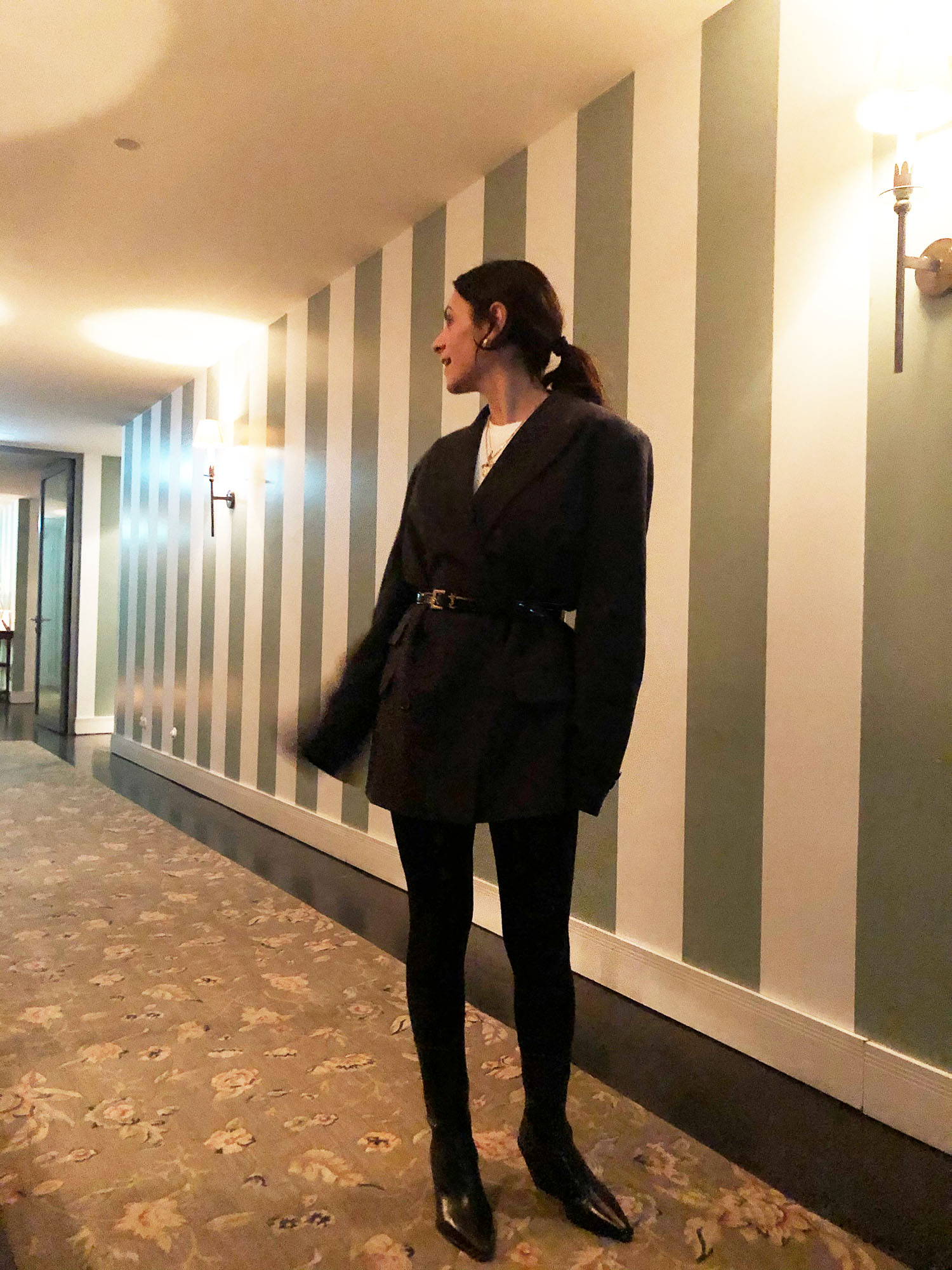 Blazer von & Other Stories Capsule, Strumpfhose von Wolford, Ankle Boots von Aeyde, T-Shirt von Carhartt (alt, ähnlich hier), Gürtel von Saint Laurent.
