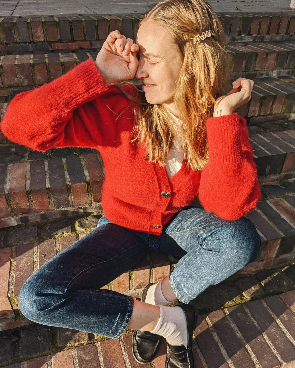 Haarspange: KDG x Jane Wayne, Cardigan: & Other Stories, Rollkragen: Kauf dich glücklich (alt), Hose: Closed, Loafer: & Other Stories (alt, ähnlich hier)