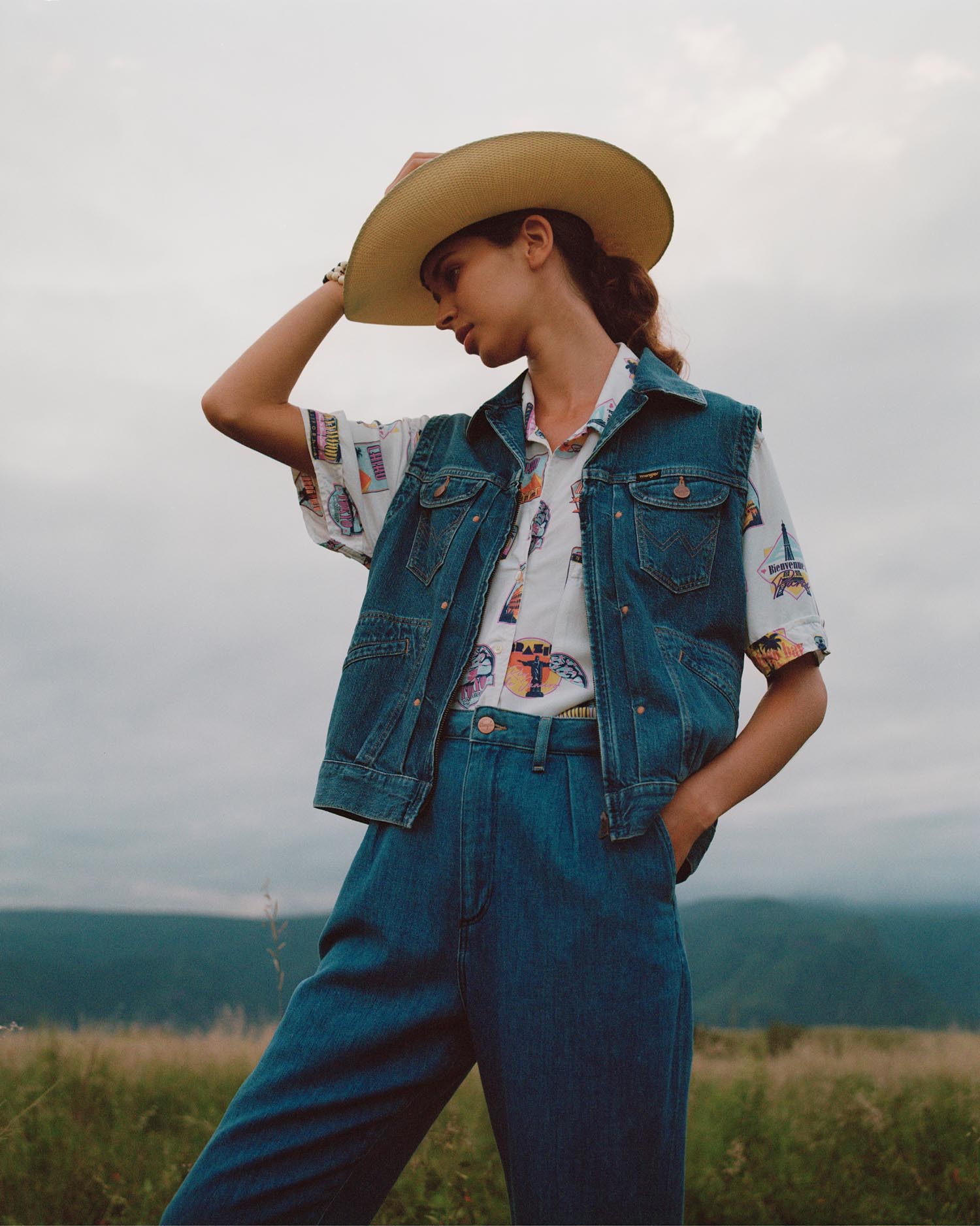 Merken wir uns: Geprintete Bluse, Jeans-Weste und Loose-Fit Hose – und ganz wichtig: Cowboy-Hut dazu! Oder auch: So darf der Frühling aussehen. Soso schön, Wrangler!