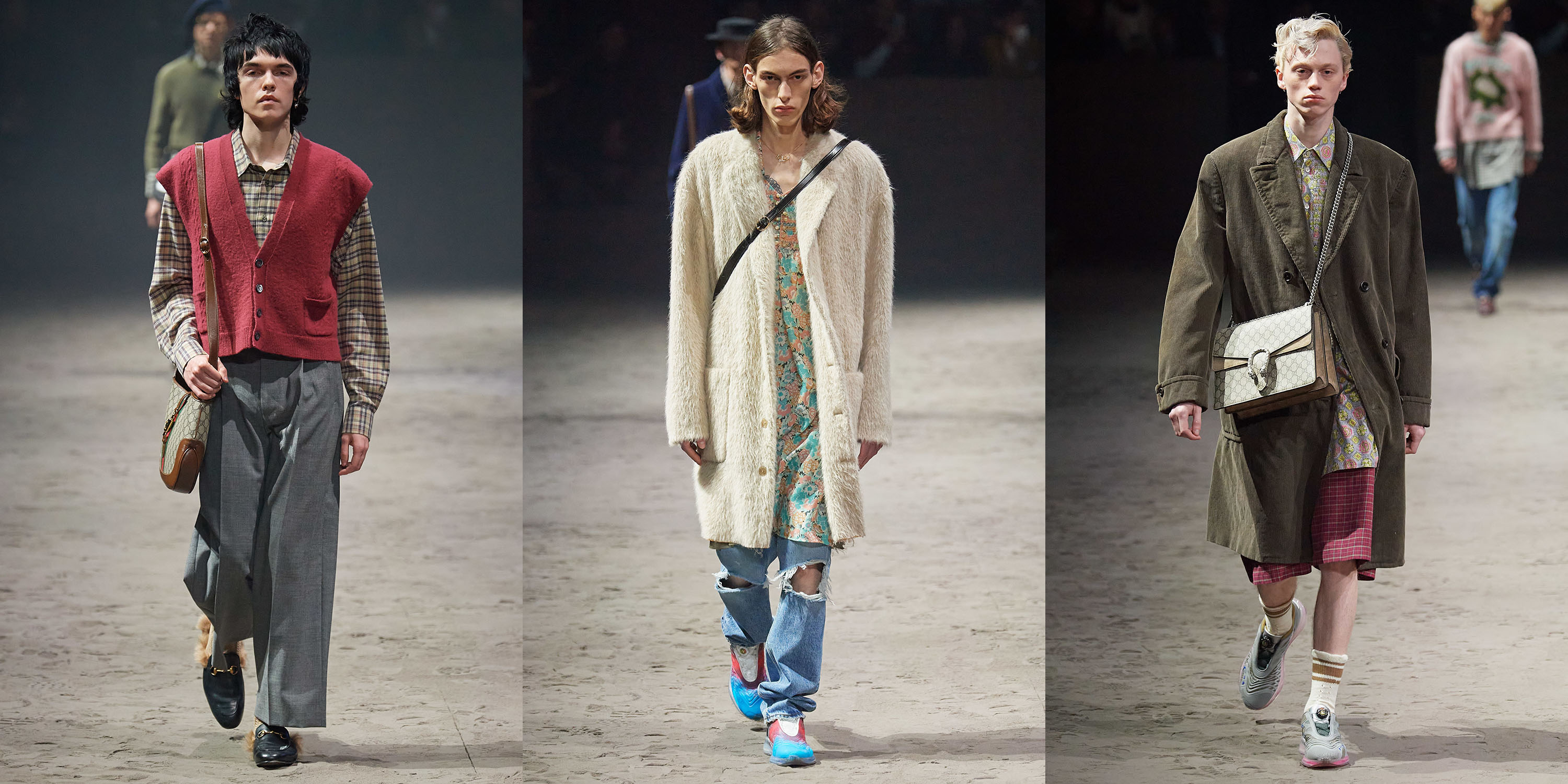 Für Gucci blickte Alessandro Michele auf die Kindheit zurück, in der Geschlechtergrenzen — zumindest in modischer Hinsicht — weitaus seltener gezogen wurden und eine Einteilung in unterschiedliche Kategorien noch keine große Rolle spielte. Auf seinem Laufsteg äußerte sich dieser Ansatz etwa in Minikleidern, kurzen Mänteln in A-Linienform und flachen Mary Janes. Ähnlich feminine Ansätze arbeiteten auch Loewe und Raf Simons in ihre Kollektionen ein: Während Letzterer korsettartige Elemente über weite Mäntel legte und so eine taillierte Silhouette formte, setzte Jonathan Anderson für Loewe auf lange, metallisch schimmernde Kleider, die über einem Blazer getragen wurden, sowie Cape-ähnliche Mäntel.
