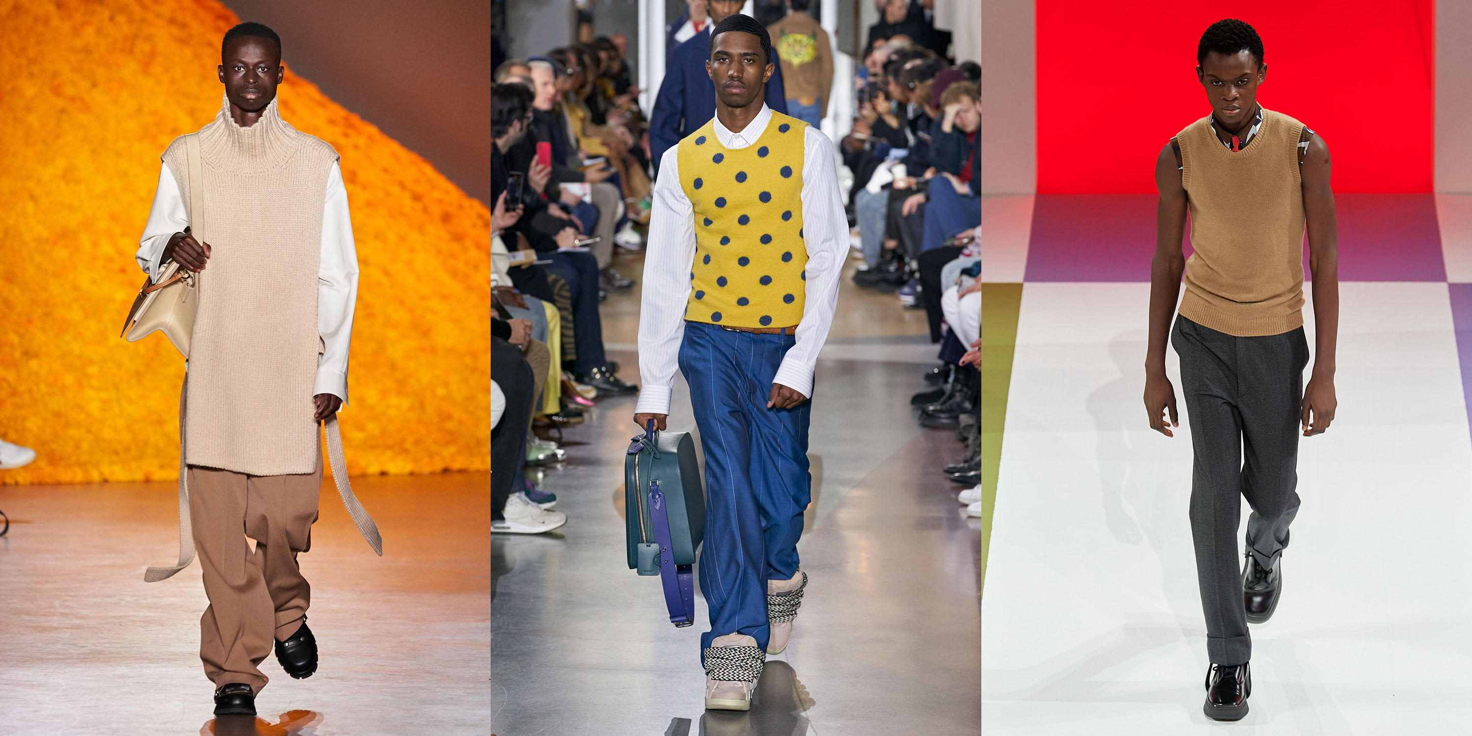 Jil Sander, Lanvin und Prada waren sich zumindest bei einem Kleidungsstück einig: Der Pullunder dürfte, mal klassisch kurz und eng wie bei Prada, mal lang und weit, wie bei Jil Sander, spätestens im kommenden Herbst den Weg in die Kleiderschränke finden. Im italienischen Modehaus trug man das besagte Stück mit ärmellosen, bunt gemusterten Hemden und zur geraden Stoffhose, Jil Sander kombinierte seine weitaus lässigeren Varianten jedoch zum weiten, langärmligen Hemd und ebenso lockeren Hose. Farbigere Varianten fand man bei Lanvin: Hier zeigte sich der gepunktete Pullunder in knalligem Gelb als Mittelpunkt.