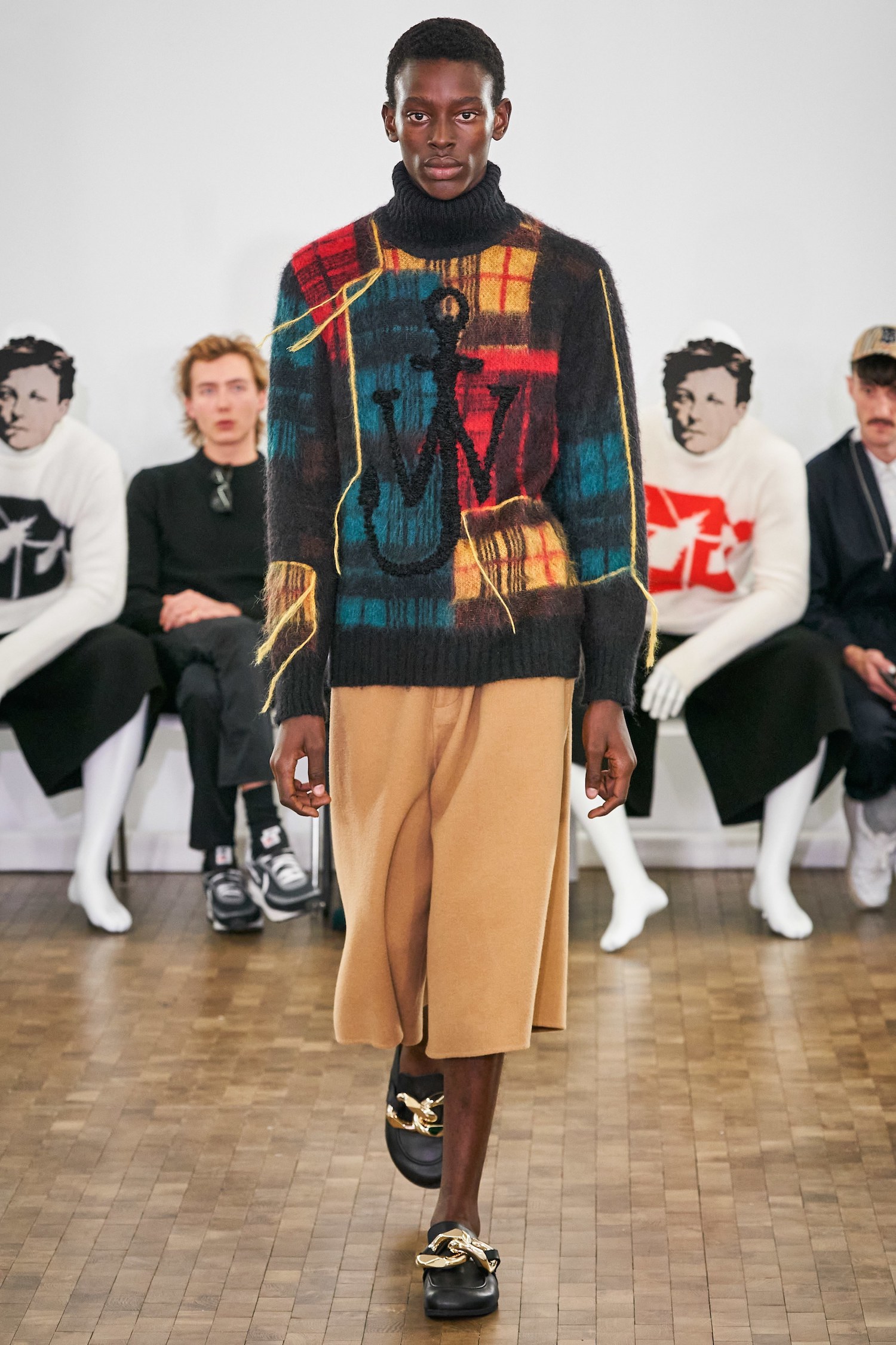 Noch immer bildet das Layering mit weiten Silhouetten ein konstantes Stilmittel für alle Jahreszeiten: Bei Marni blieben die Beine nackt, lange Hemden und Pullover galten als Kleid-Ersatz, die Stiefel reichten fast bis zu den Knien. Ähnlich ging es bei JW Anderson zu, lediglich trug man hier Hosen in Culotte-Form zu klassischen Strickpullovern und flachen Loafers, an denen dicke, goldene Kettenelemente prangten.