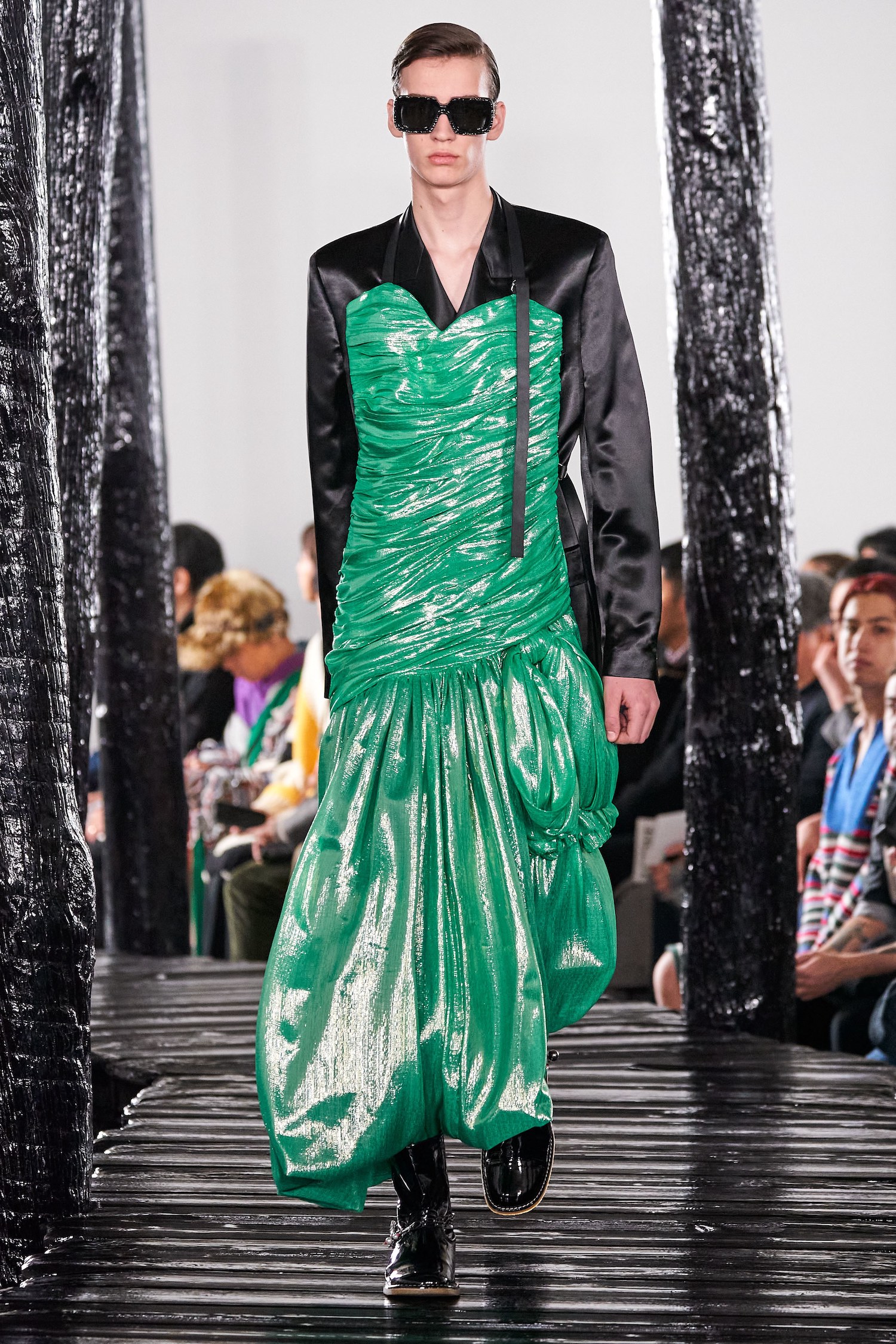 So führte uns etwa Gucci in vergangene Kindertage, in denen Mode noch weniger festgelegt war, und zeigte ebenso Rüschenkleider, als auch jungenhafte Schuluniformen. Mit ähnlichen Elementen spielten etwa Loewe und Raf Simons, die mal lange Kleider, mal korsettartige Details zeigten − ein Beweis dafür, dass sich das Spektrum der Männermode schon längst ausgeweitet hat und somit auch neue Zielgruppen erschließen kann. Neben dem Spiel mit stereotypischen Geschlechtergrenzen wurden außerdem weite und übergroße Mäntel sowie jede Menge Pullunder und Layering präsentiert — die Highlights haben wir euch auf einen Blick zusammengetragen.