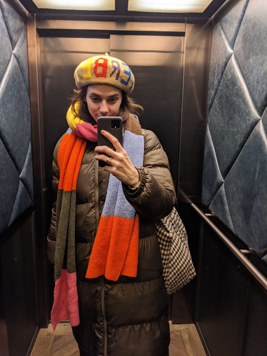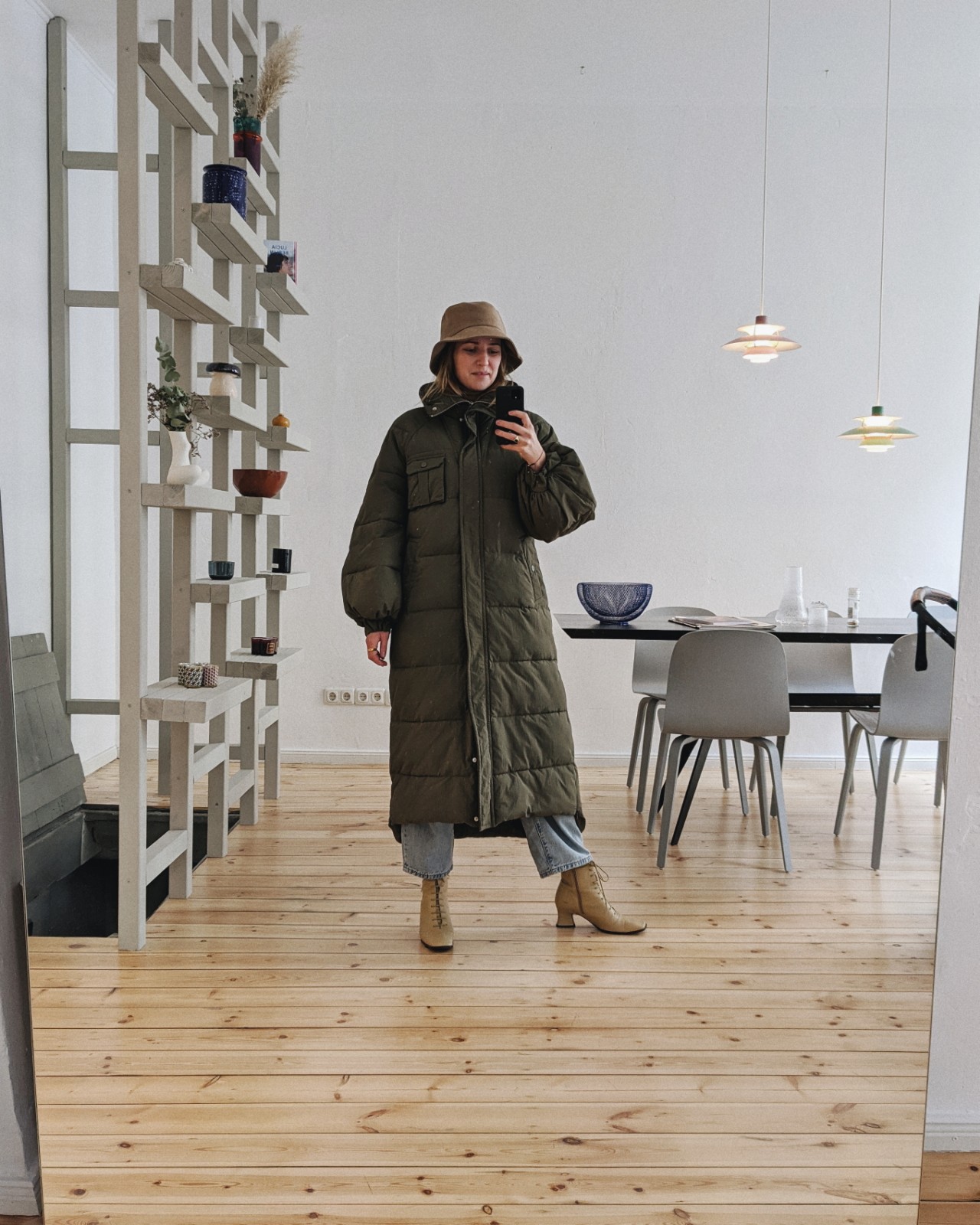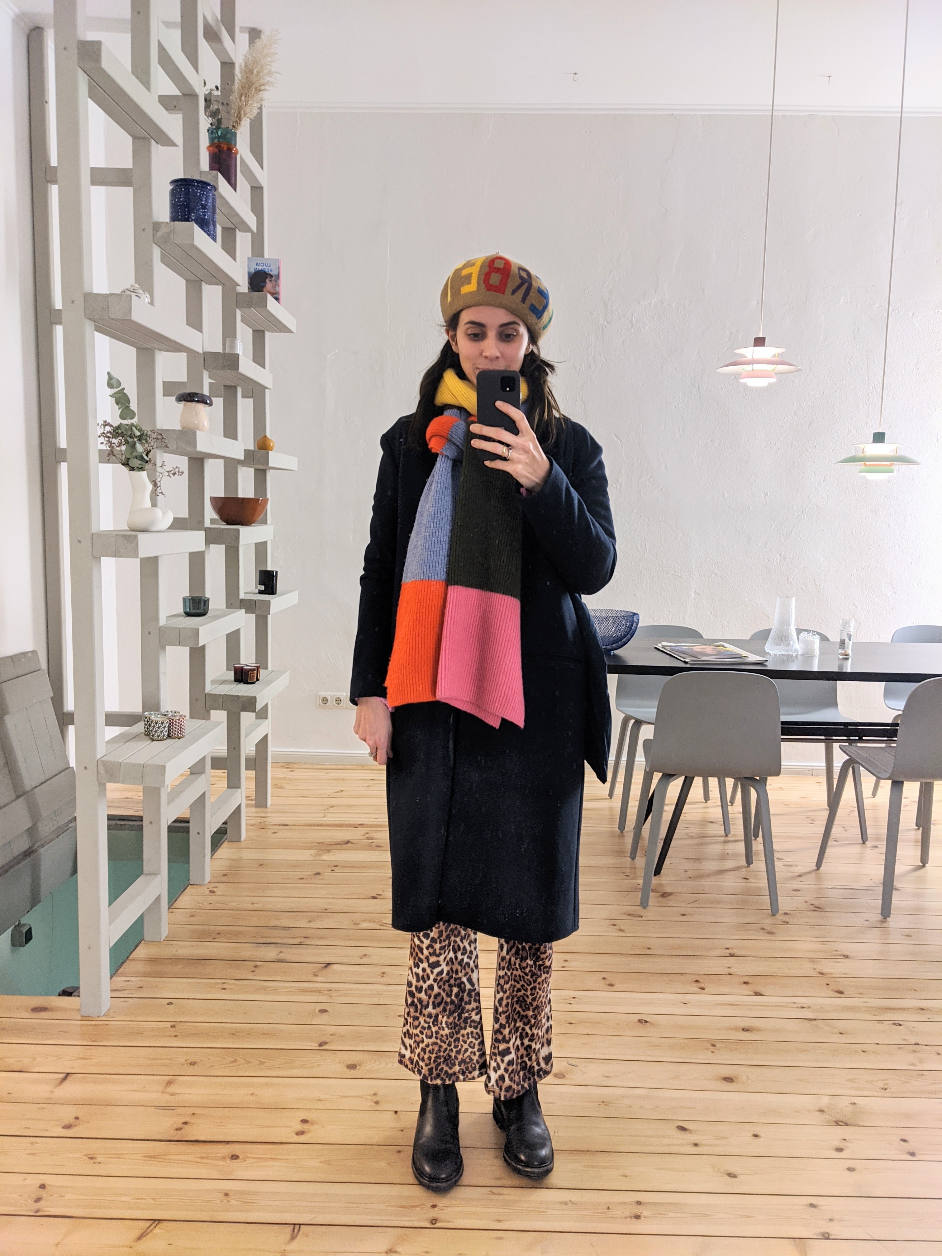 Mütze: von Mama, Schal: Ganni, Mantel: Norse Projects, Boots: Arket