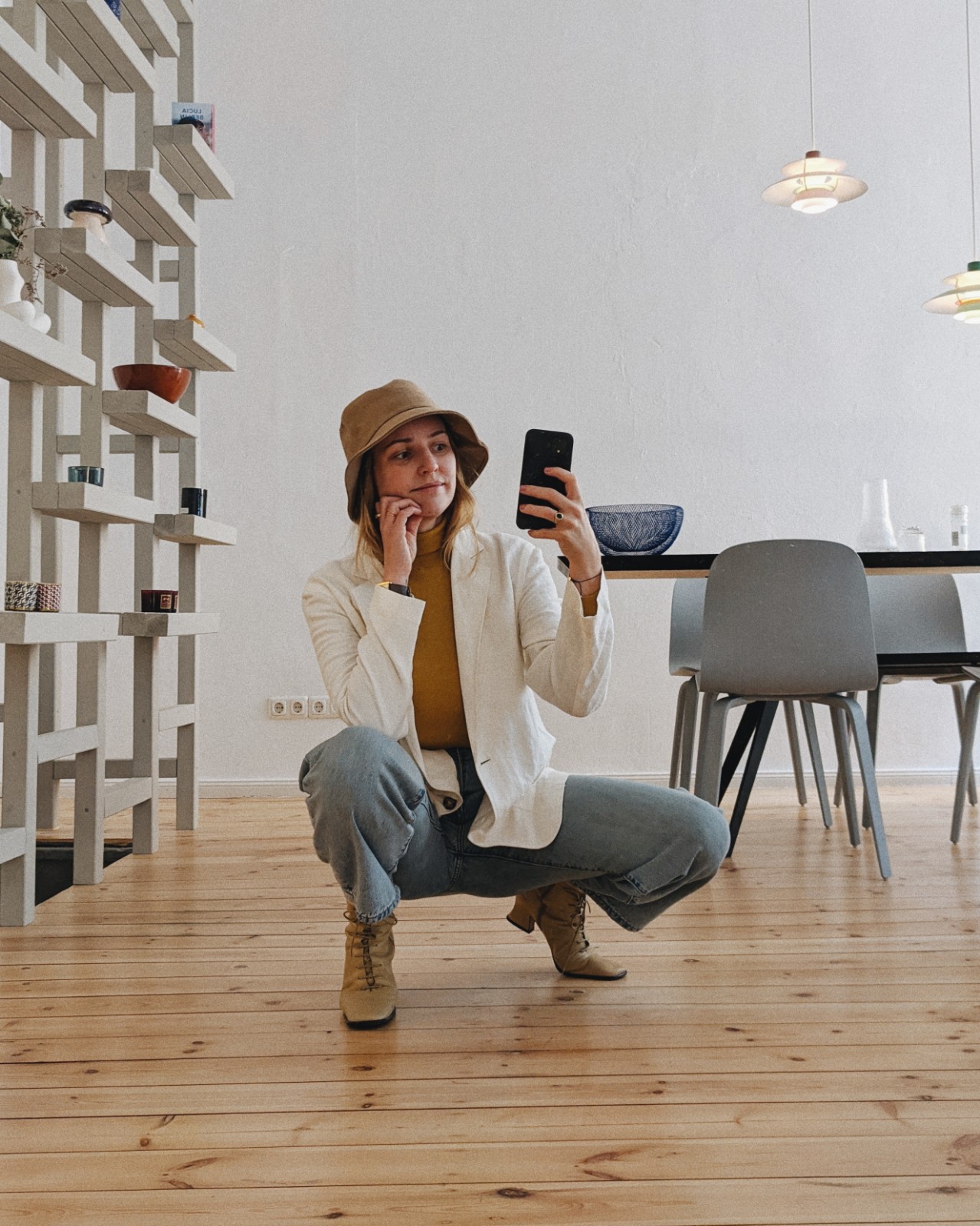 Hut: & Other Stories (alt, ähnlicher hier), Rollkragen: Lacoste (alt, ähnlicher hier), Blazer: & Other Stories, Hose: Levi’s Big Baggy (alt, ähnliche hier), Schuhe: By Far (alt, ähnliche hier)