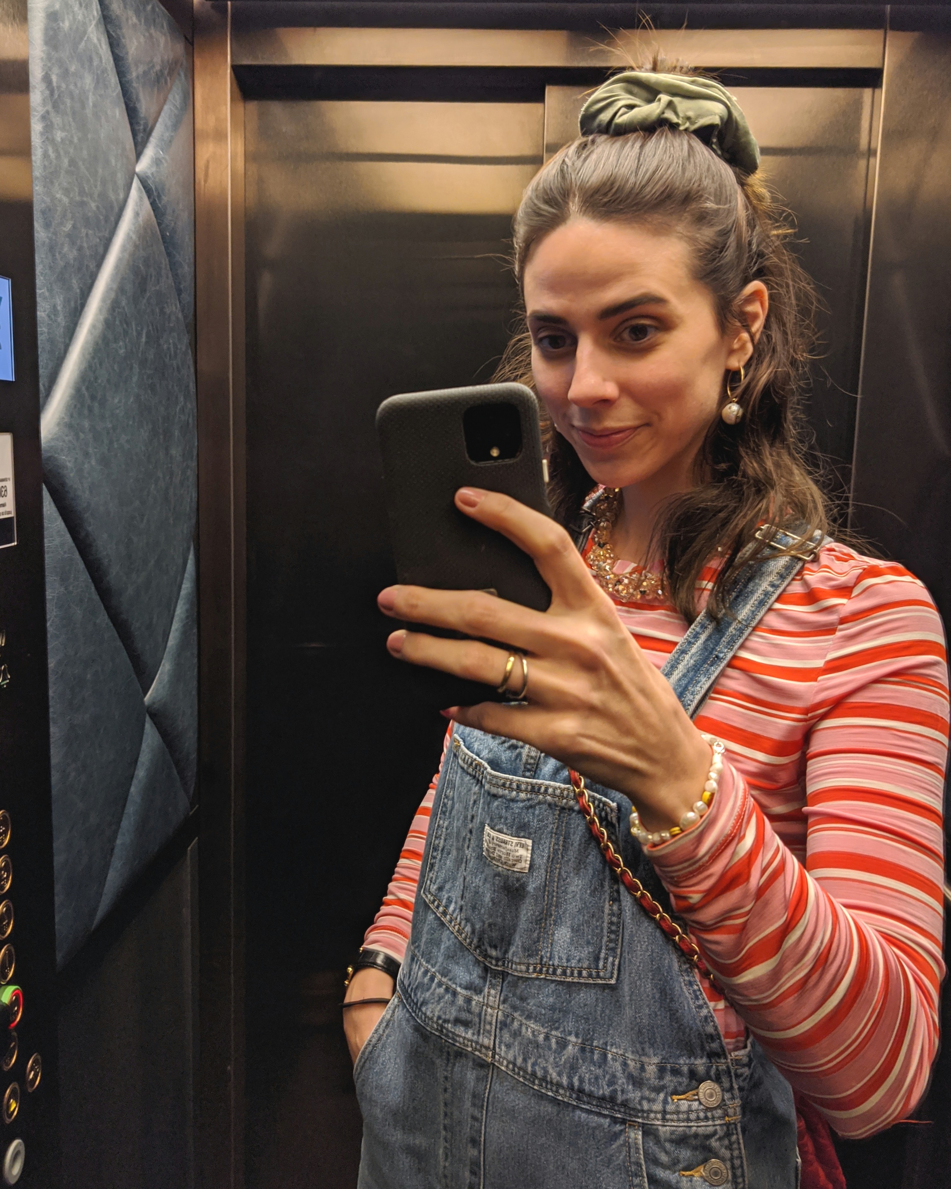 Scrunchie: Jane Wayne x KDG, Longsleeve: Stine Goya, Latzhose: Levi’s, Tasche: Chanel, Ohrringe: Jane Kønig, Armband: Wald Berlin