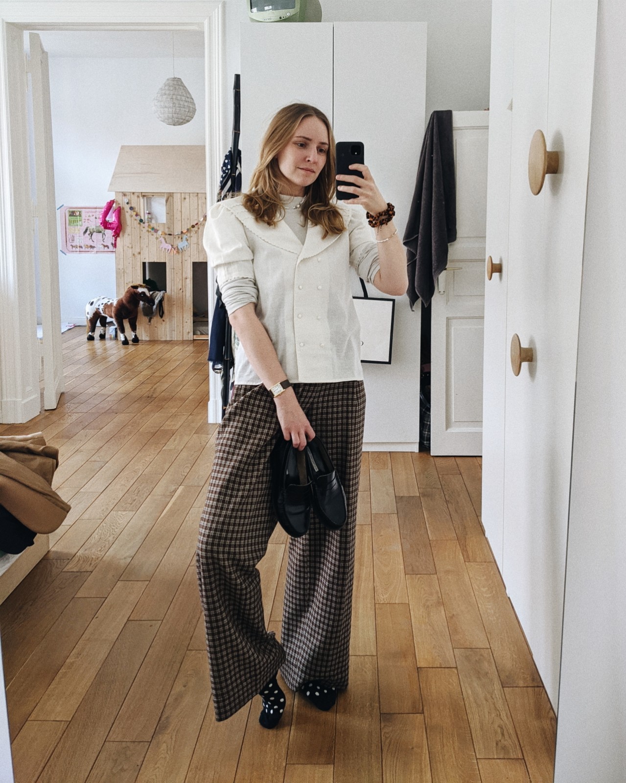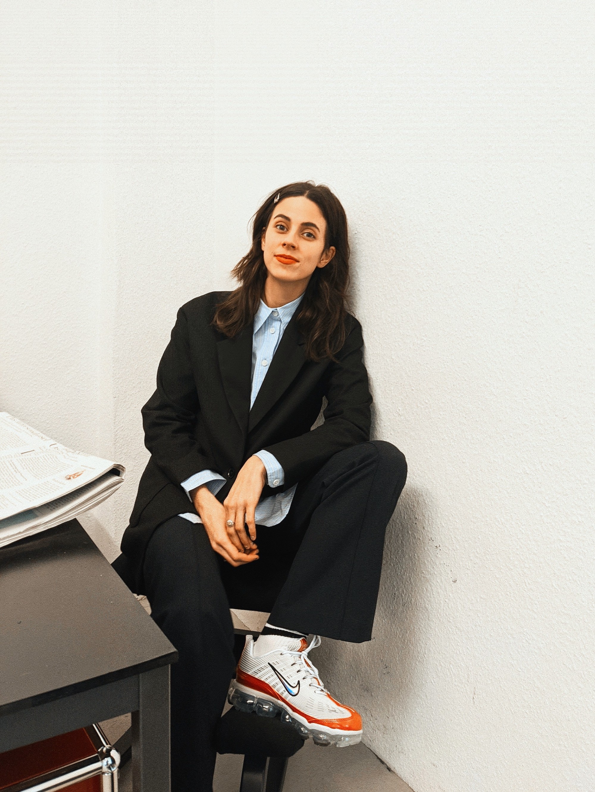 Blazer: Edited the Label, Hose: Arket, Hemd: Ganni, Schuhe: Nike