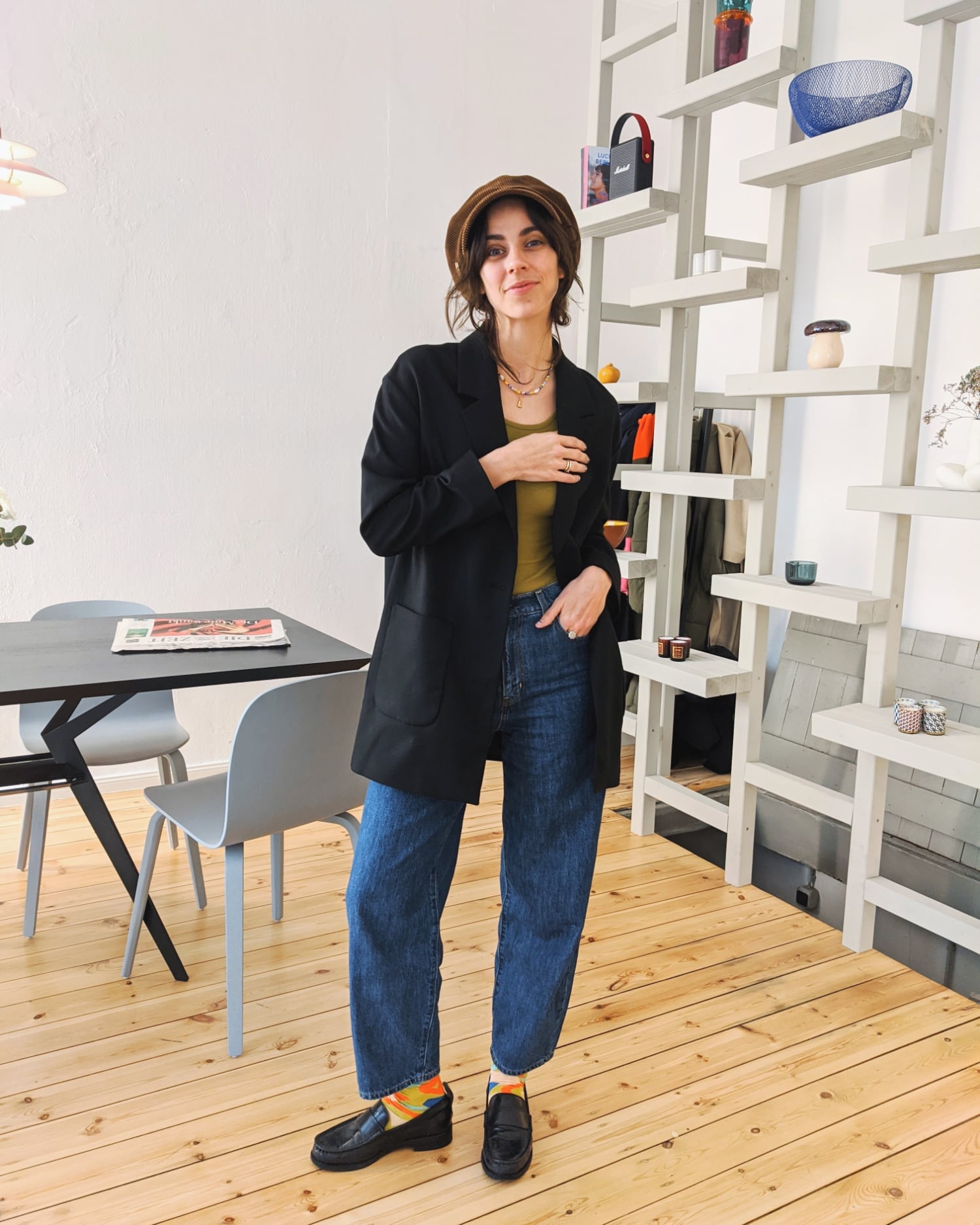 Blazer: Edited the Label, Jeans: Levi’s Balloon, Socken: Happy Socks, Mütze: Prada