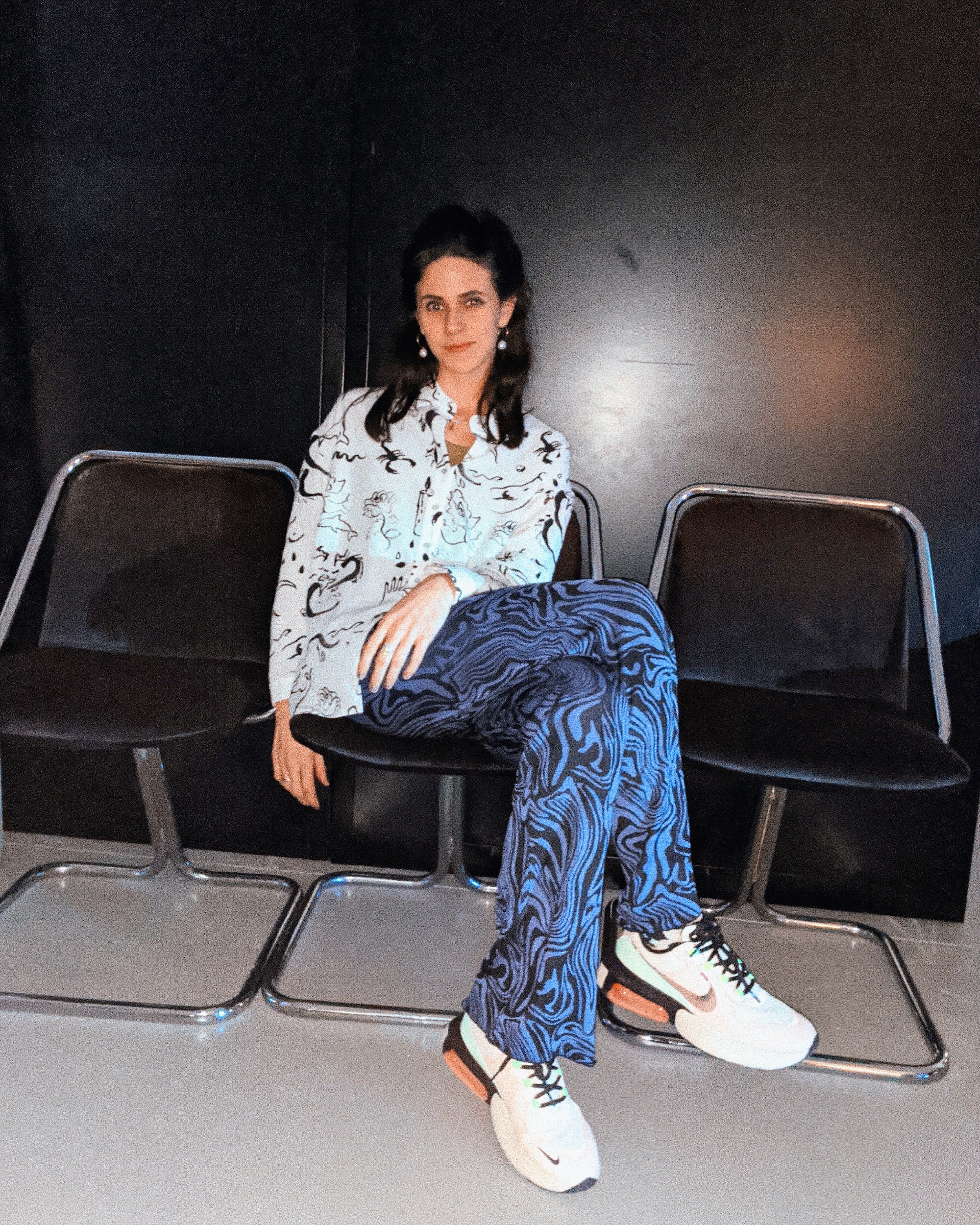 Bluse: Paloma Wool, Hose: Paloma Wool, Schuhe: Nike