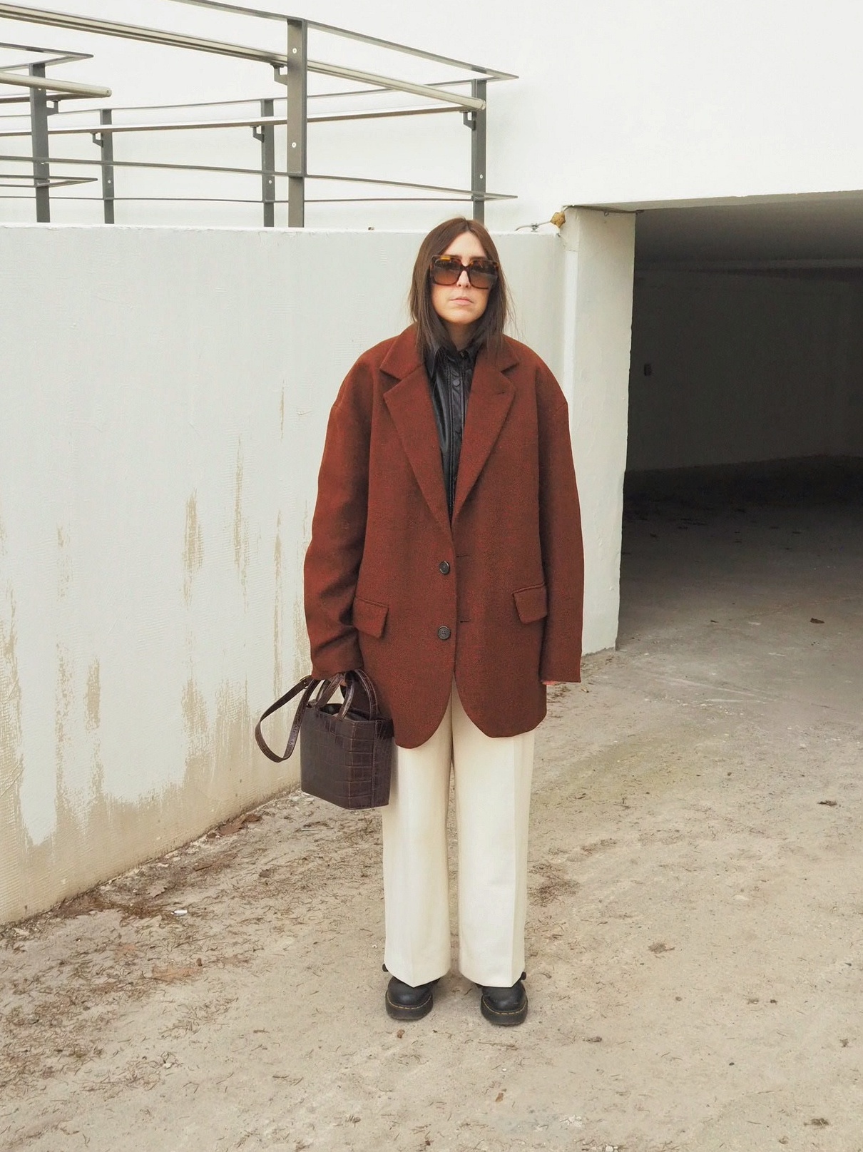 Blazer von Raey, Hose von Samsøe & Samsøe (alt, ähnlich hier), Schuhe von Dr. Martens (alt), Tasche von Staud (ausverkauft)