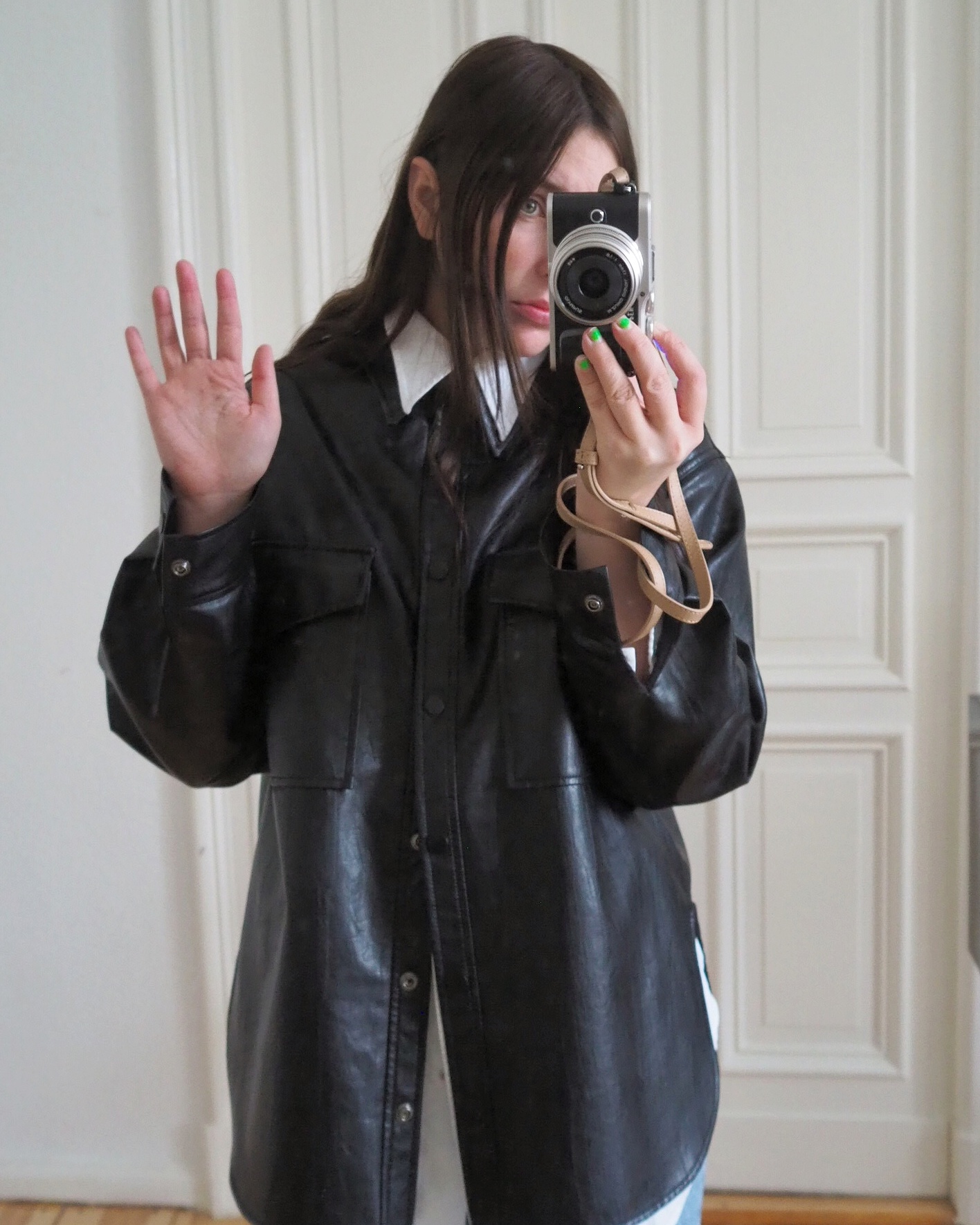 Shirt aus veganem Leder von Pixiemarket, weißes Hemd von Calvin Klein (alt, ähnlich hier