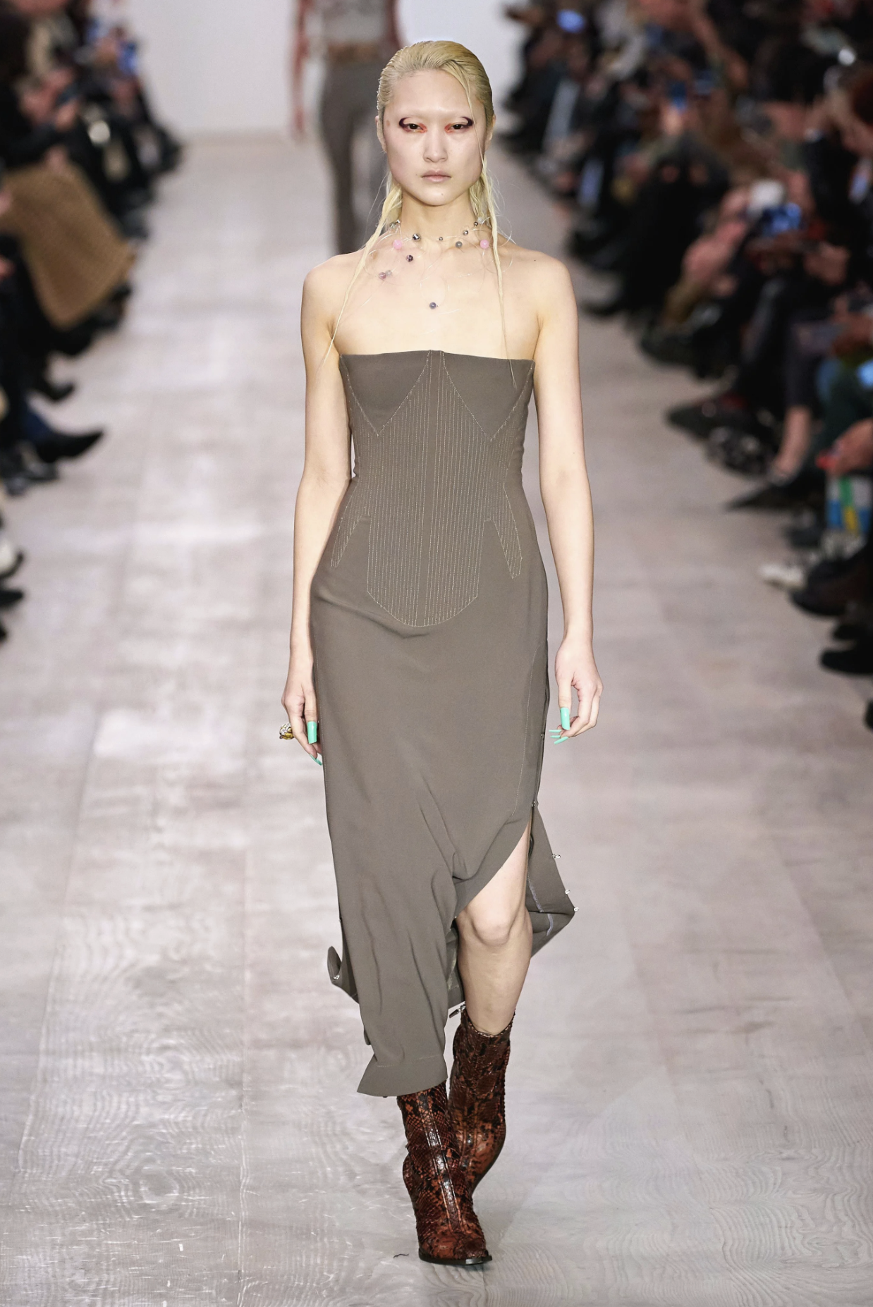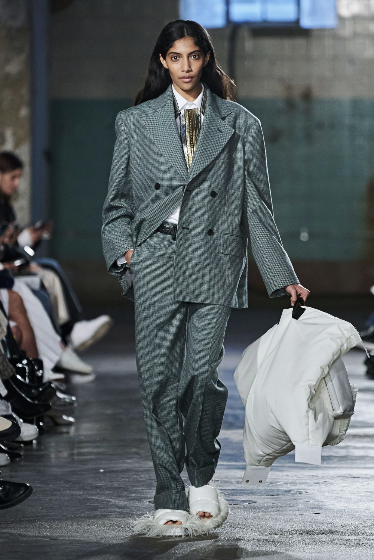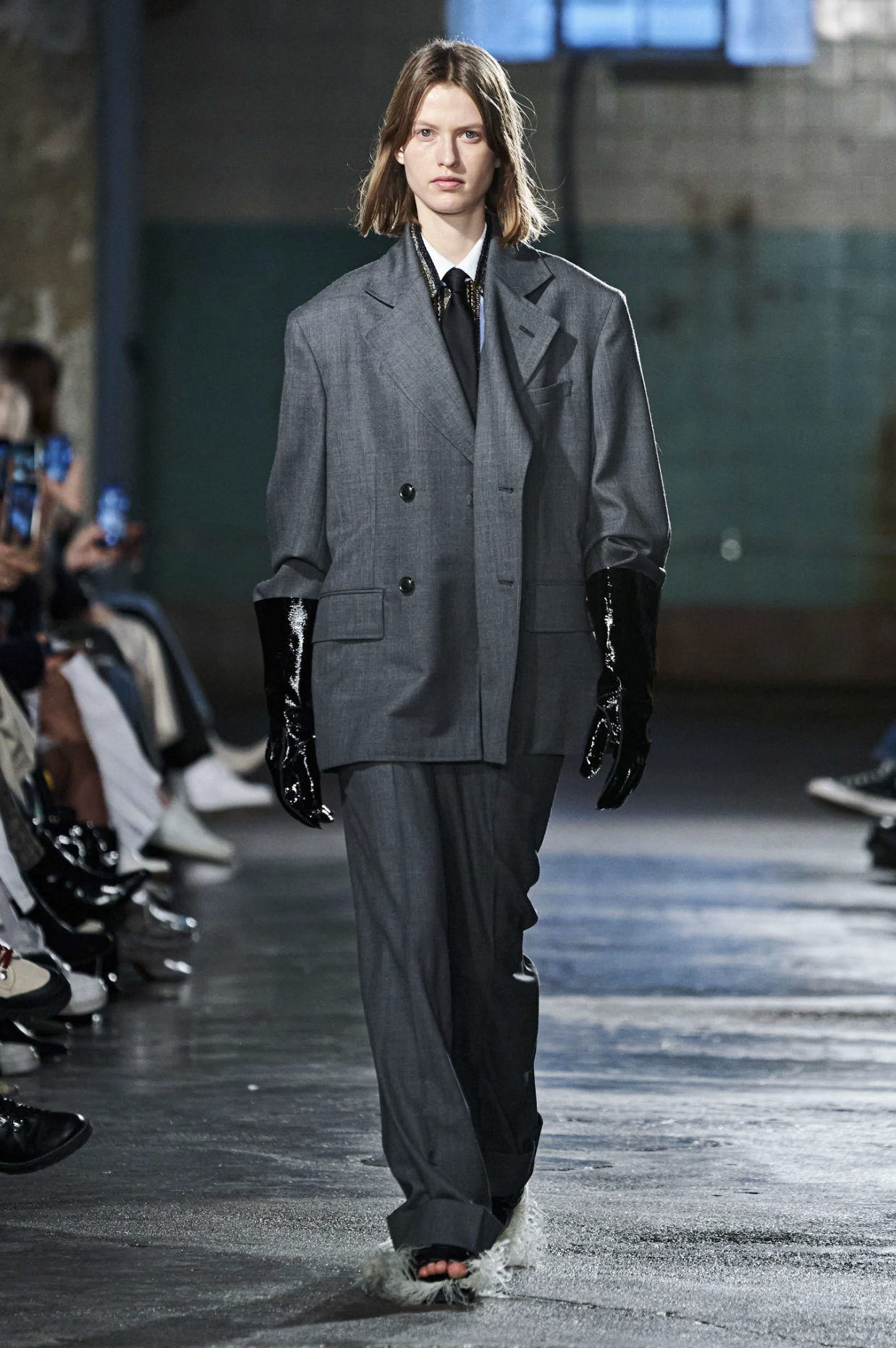 Natürlich haben wir zu diesem Zeitpunkt bereits jede Menge von Menswear inspirierte Anzüge gesehen, dennoch machen die kastenförmigen Modelle des japanischen Labels Toga Lust auf mehr. Mehr heißt hier auch: Krawatten und Lederhandschuhe, die bis zum Ellenbogen hochgezogen werden — über die mit Federn besetzten Schuhe lässt es sich hingegen streiten.