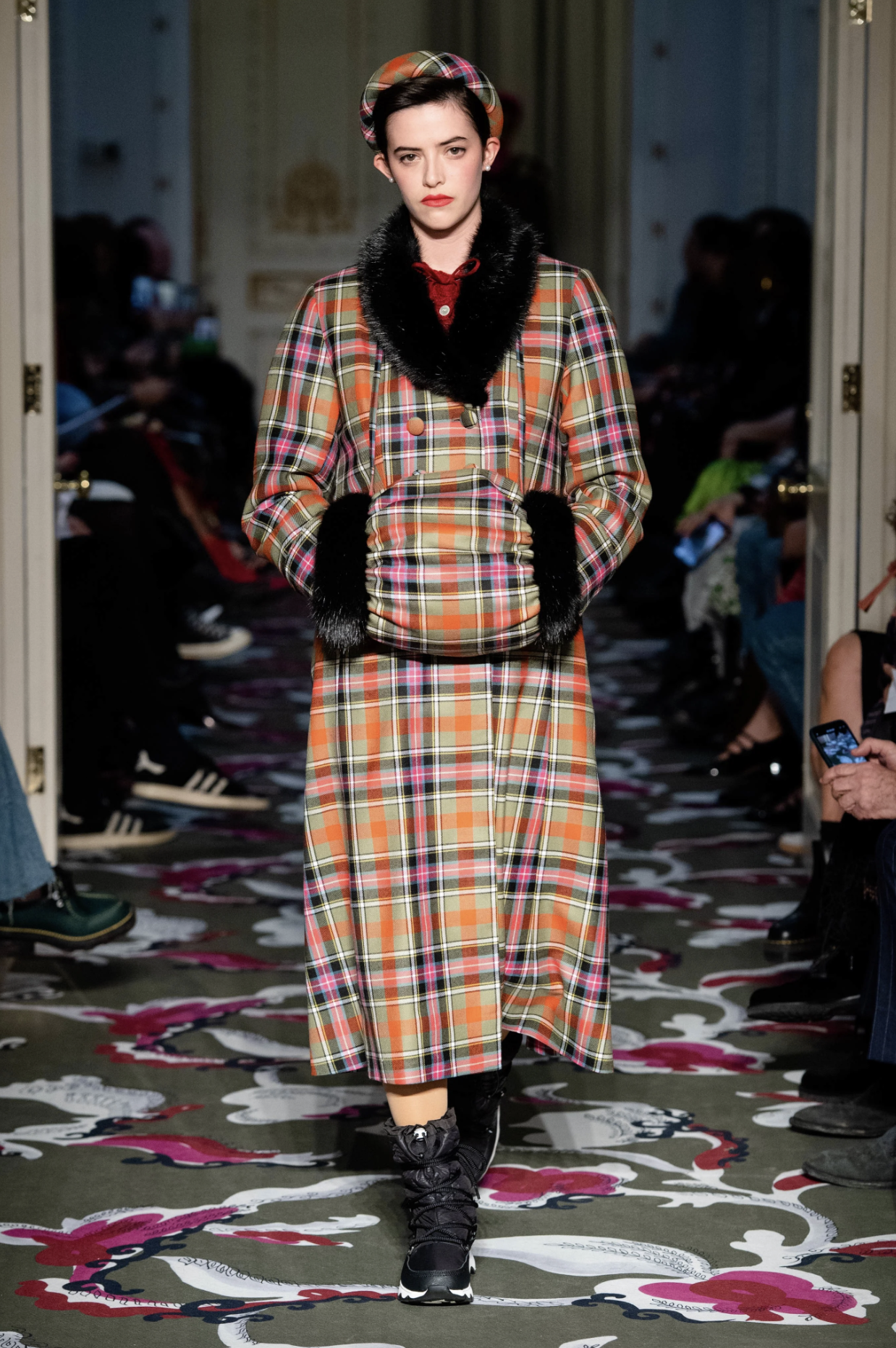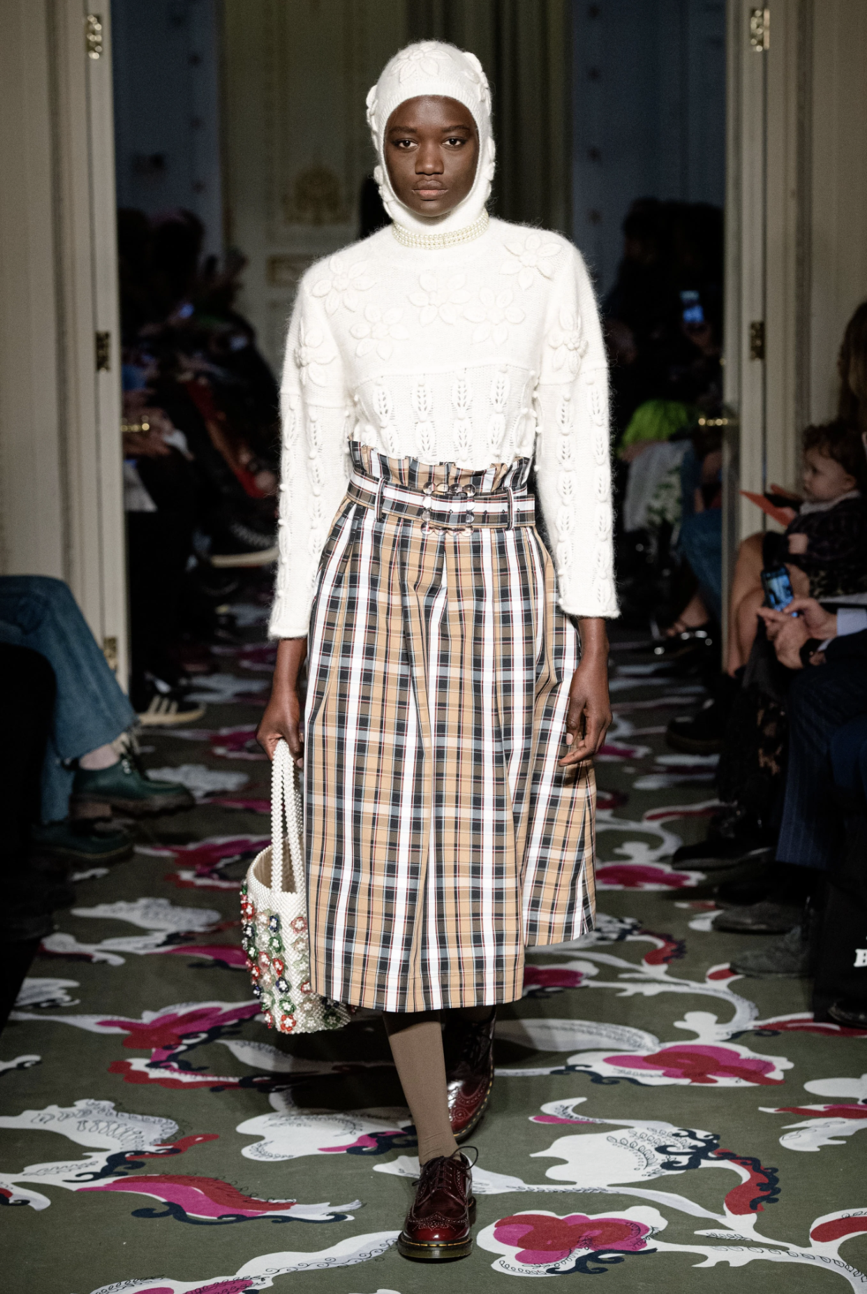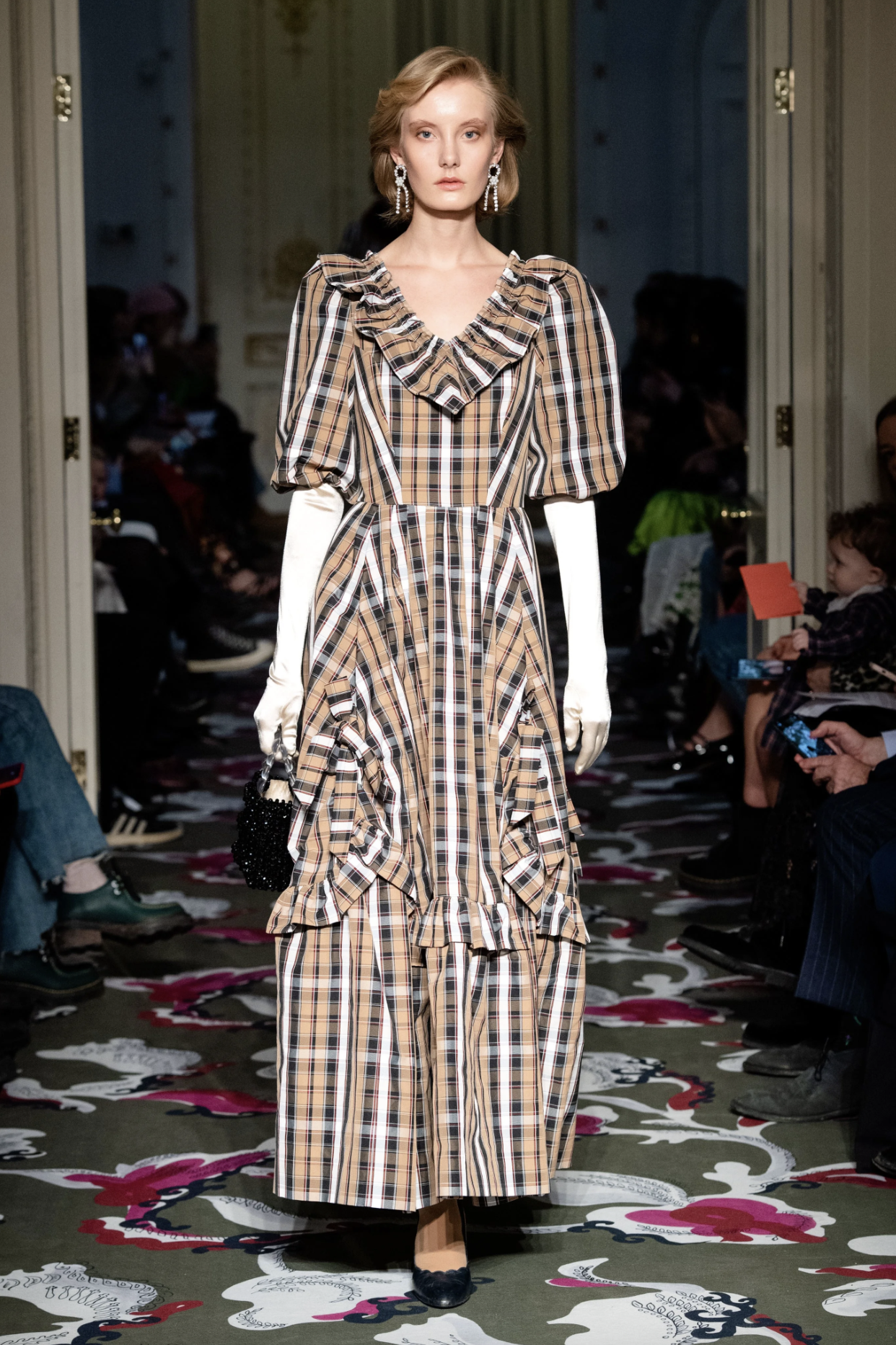 Die britische Designerin Molly Goddard ist für ihre ausladenden, üppigen Designs und Tüllbahnen bekannt. Und auch dieses Mal waren die weit ausgestellten Kleider reichlich zu sehen und füllten teils die gesamte Breite des Laufstegs aus. Dabei erinnerten die übergroßen Schleifen auf dem Kopf, die vielen Volants und Rüschen sowie die verspielten Stickereien auf den Pullovern durchaus an frühere Puppenkleider. Neben Womenswear präsentierte die Designerin erstmals auch Menswear — der Goddard-Mann trägt karierte Anzugshosen, Strick-Cardigans und Mäntel mit Peter-Pan-Kragen.
