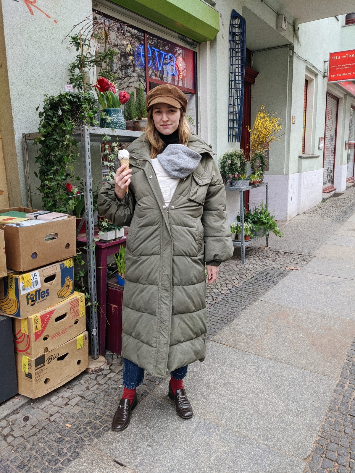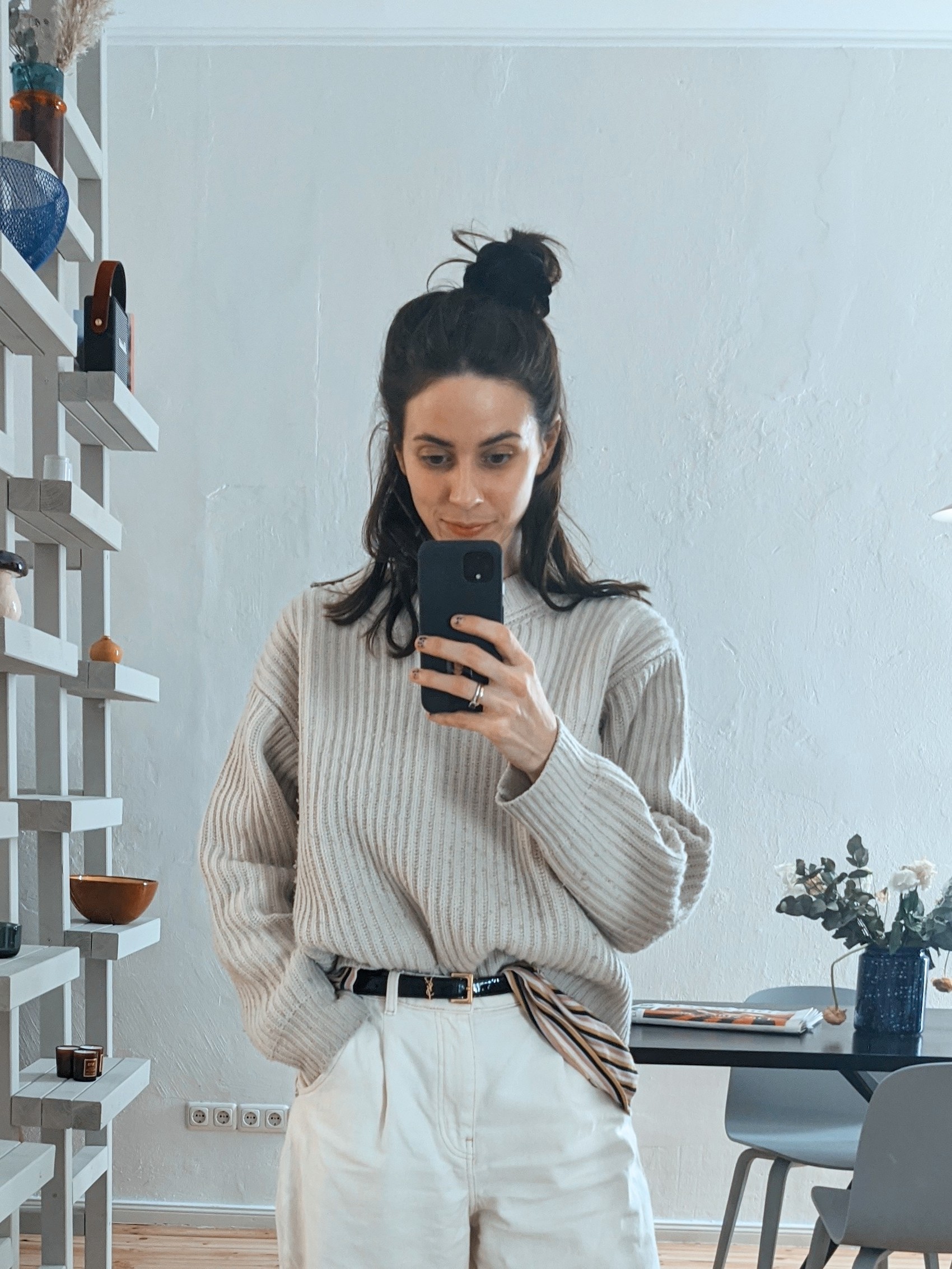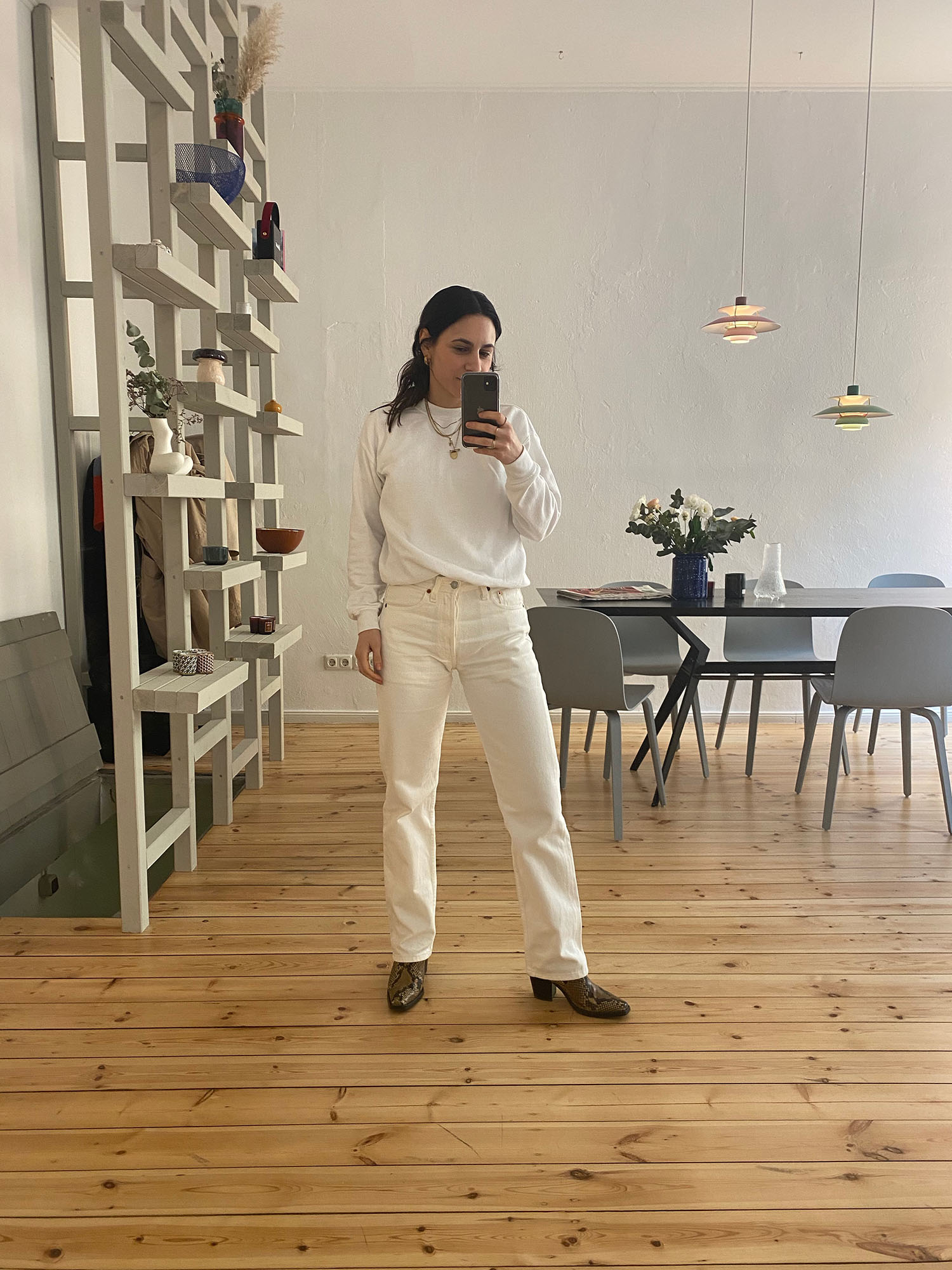 Ich hatte diese Woche zwei große Fotoshootings und war eigentlich nur am Schleppen. Kleidung von A nach B zu bringen ist ein großer Teil meiner Arbeit als Stylistin. Und ehrlich gesagt, komme ich da manchmal an meine körperlichen Grenzen. Ich wohne im dritten Stock ohne Aufzug und zwei große Koffer mit je 20 Kilo hochzuschleppen ist für mich superanstrengend. Ich bin aber auch selber schuld, denn ich habe mich schlecht organisiert. Unser Büro ist ebenerdig und ich sollte den Umweg morgens vor dem Shooting in Kauf nehmen und hier alles lagern. Das habe ich mir fest vorgenommen. Und direkt eine Kleiderstange und Kleiderbügel für das Büro gekauft. Bei der ganzen Vorbereitung trage ich öfter Leggings. Ist bequem und unter einem Mantel kaum sichtbar. Und Leggings haben, wie schon gesagt, ein großes Comeback. Haha! Aber abgesehen von Leggings habe ich eine neue Levi’s 501 Hose aus weißem Denim. Ich habe lange nach einer neu-alten Hosen in Weiß gesucht und bin so happy über meinen Fund, dass ich mich, tagein tagaus, komplett in Weiß kleide. Nicht ganz passend zum fiesen Regenwetter in Berlin, aber egal!