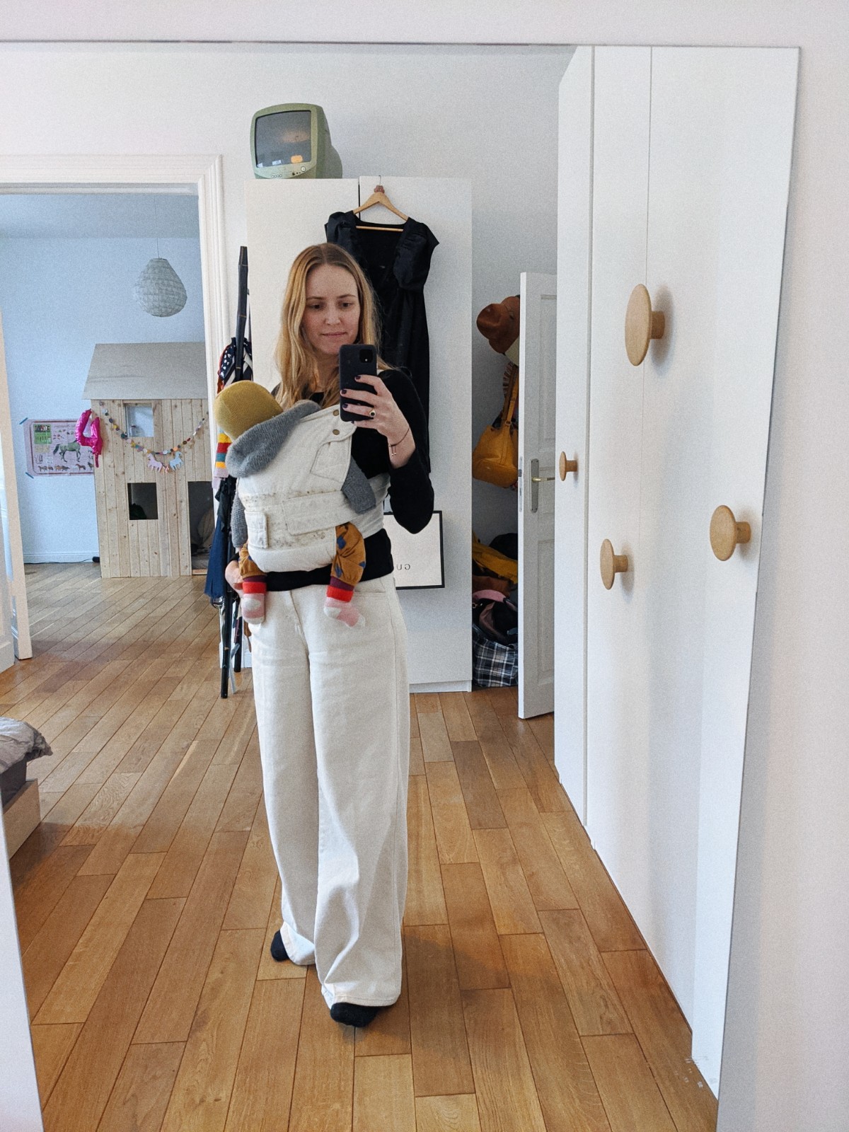 Mantel: Ganni, Mütze: Prada, Jeans: Closed, Schuhe: Gucci via Vestiaire Collective, Socken: COS, Babytrage: Marsupi