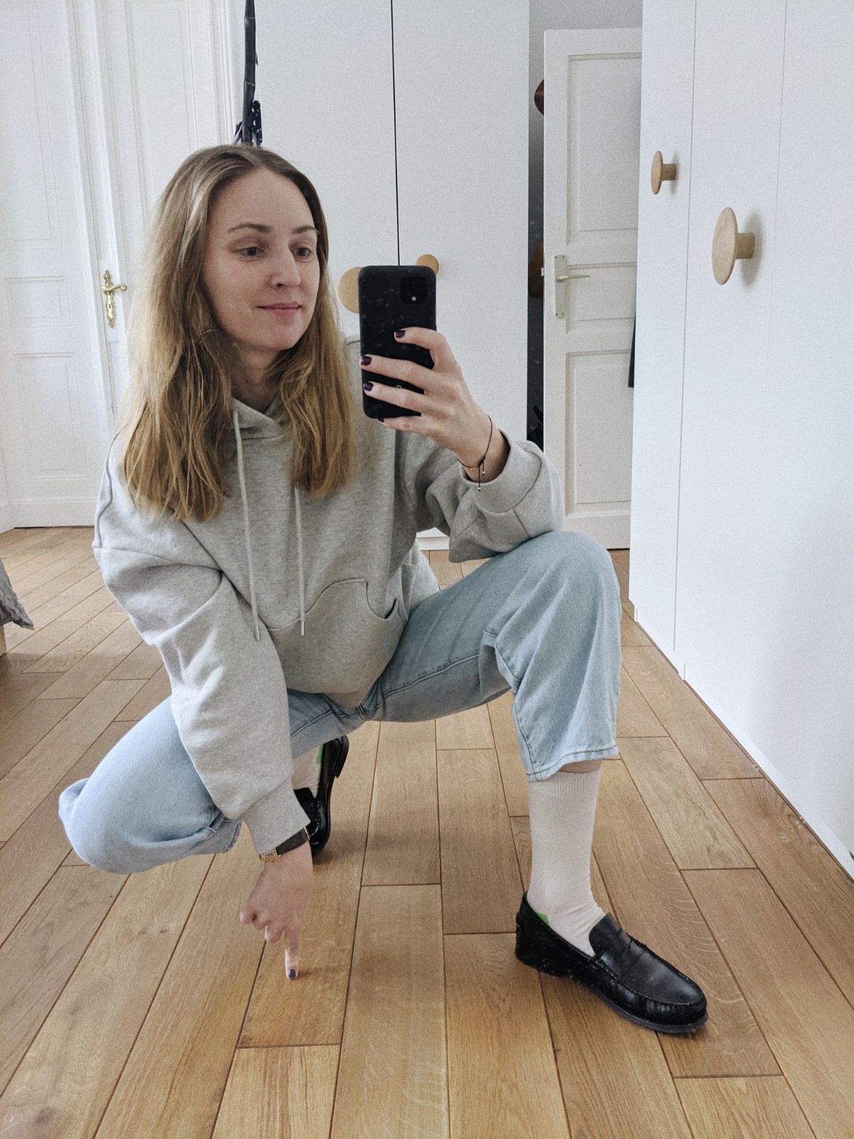 Pulli: & Other Stories, Jeans: Levi’s Balloon, Socken: Happy Socks, Schuhe: & Other Stories (alt)