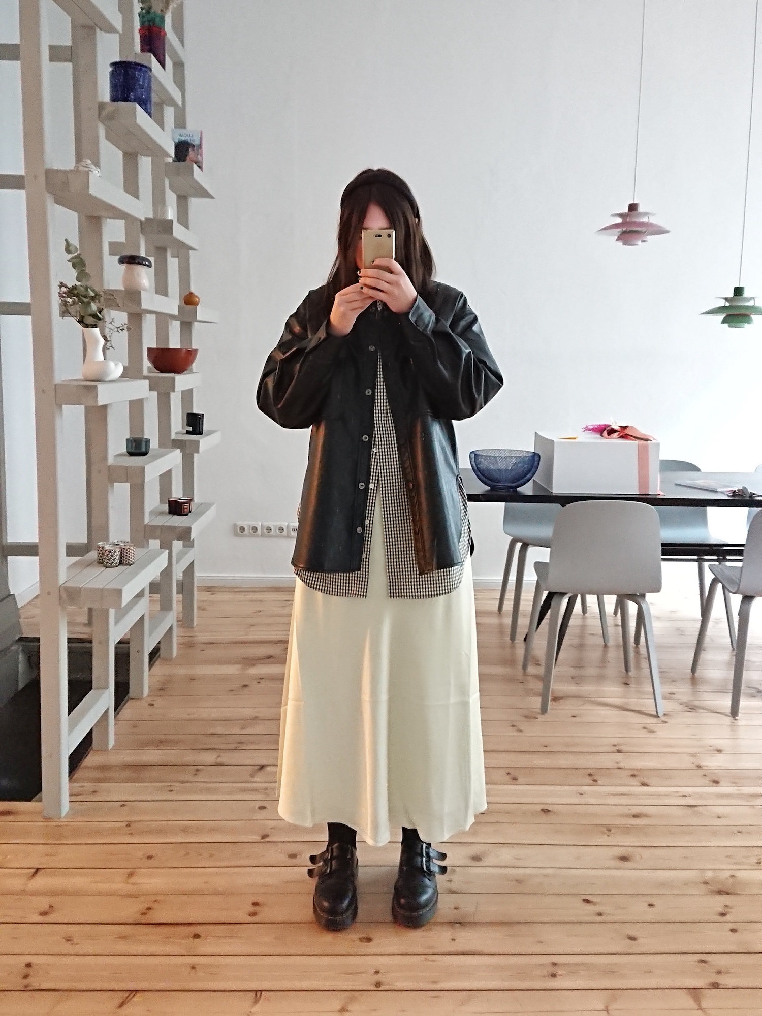 Links: Hemd aus veganem Leder: Pixiemarket, kariertes Hemd: 3.1 Phillip Lim via The Outnet, Kleid: Filippa K, Schuhe: Dr. Martens