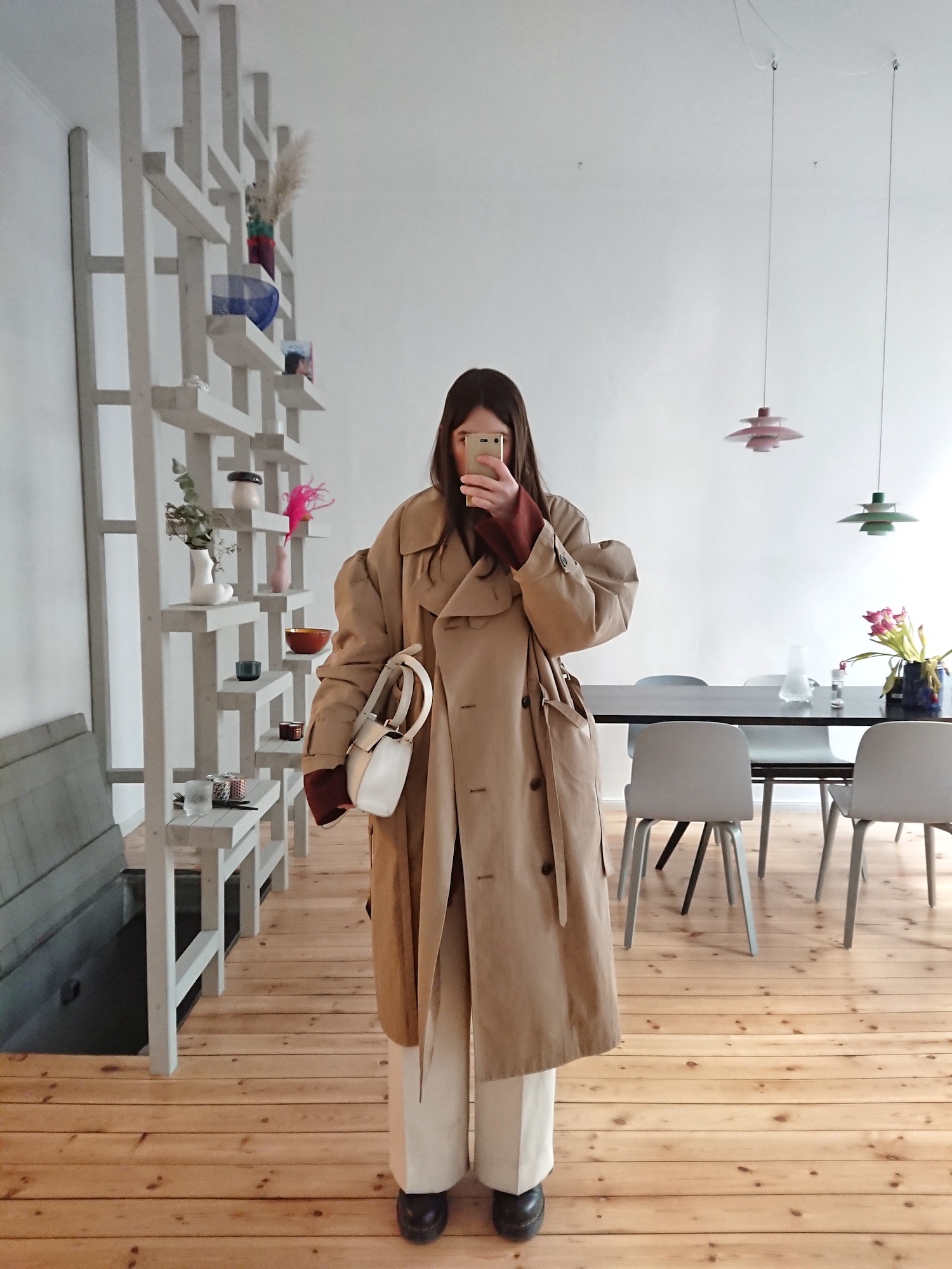 Rechts: Trenchcoat: Pushbutton (alt), Hose: Samsøe Samsøe (alt, ähnlich hier), Schuhe: Dr. Martens, Tasche: Loeil via Vestiaire Collective