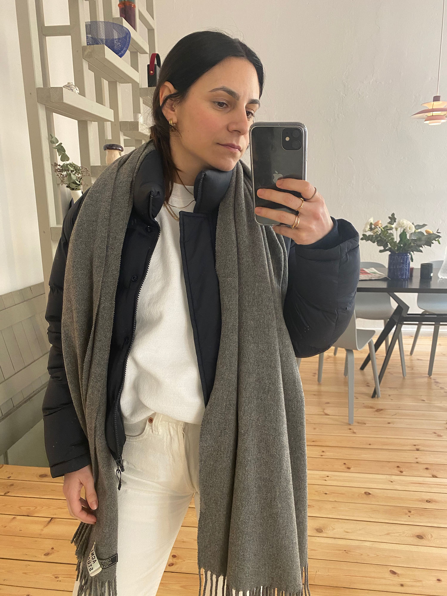 Pullover: Gildan, Hose: Levi’s 501 Vintage ähnliche hier, Schal: Acne Studios, Daunenjacke: Uniqlo