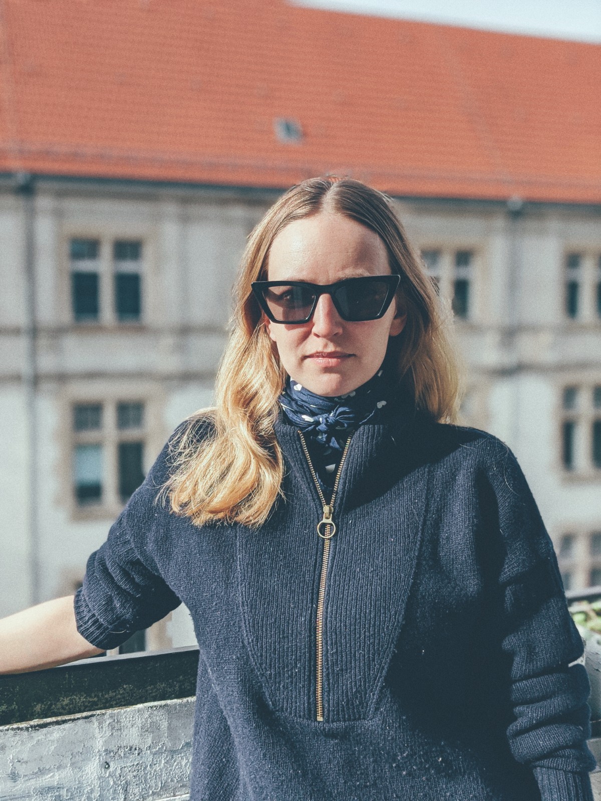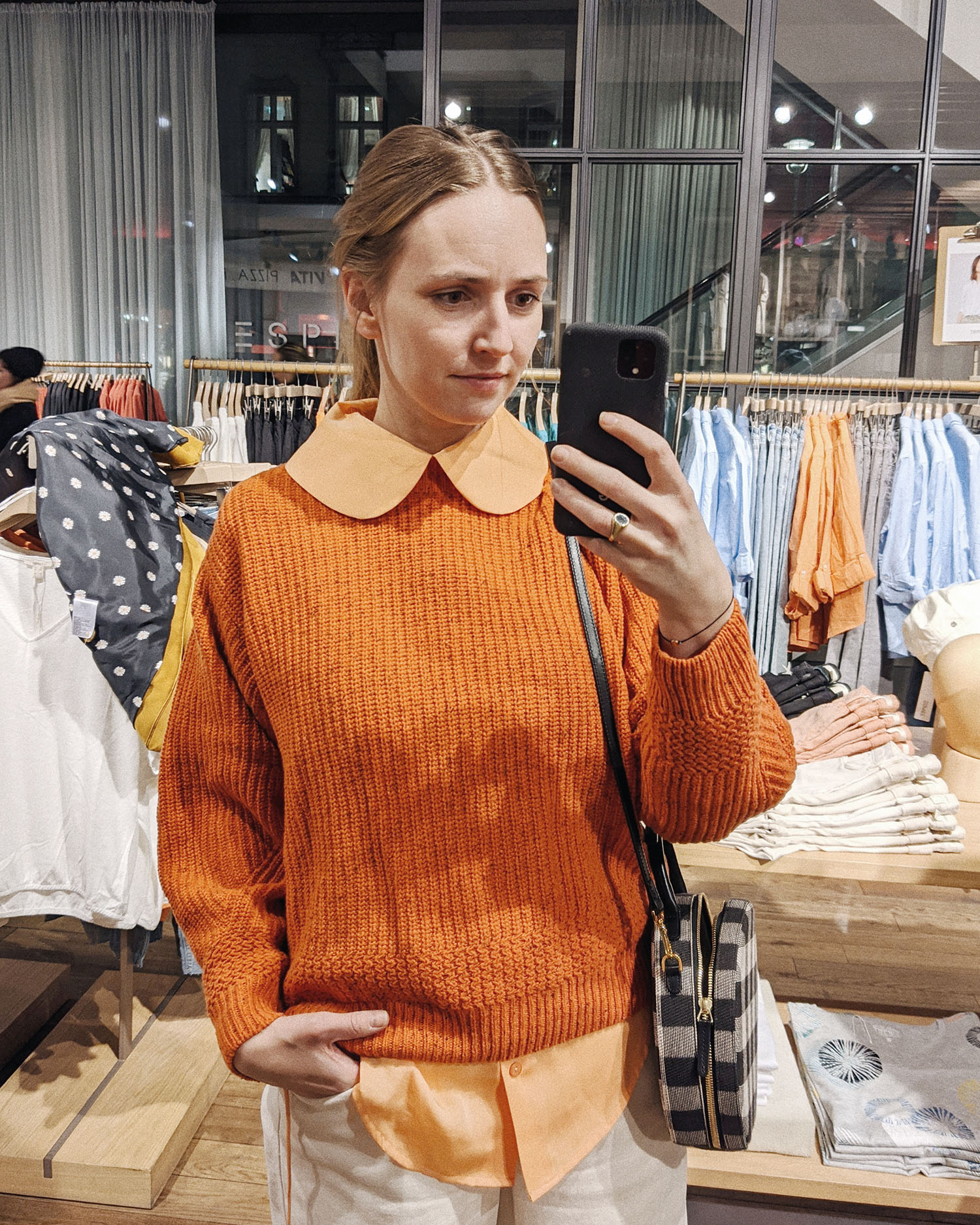 Bluse: Baum & Pferdgarten, Pulli: lala Berlin, Jeans: Closed, Tasche: Mansur Gavriel