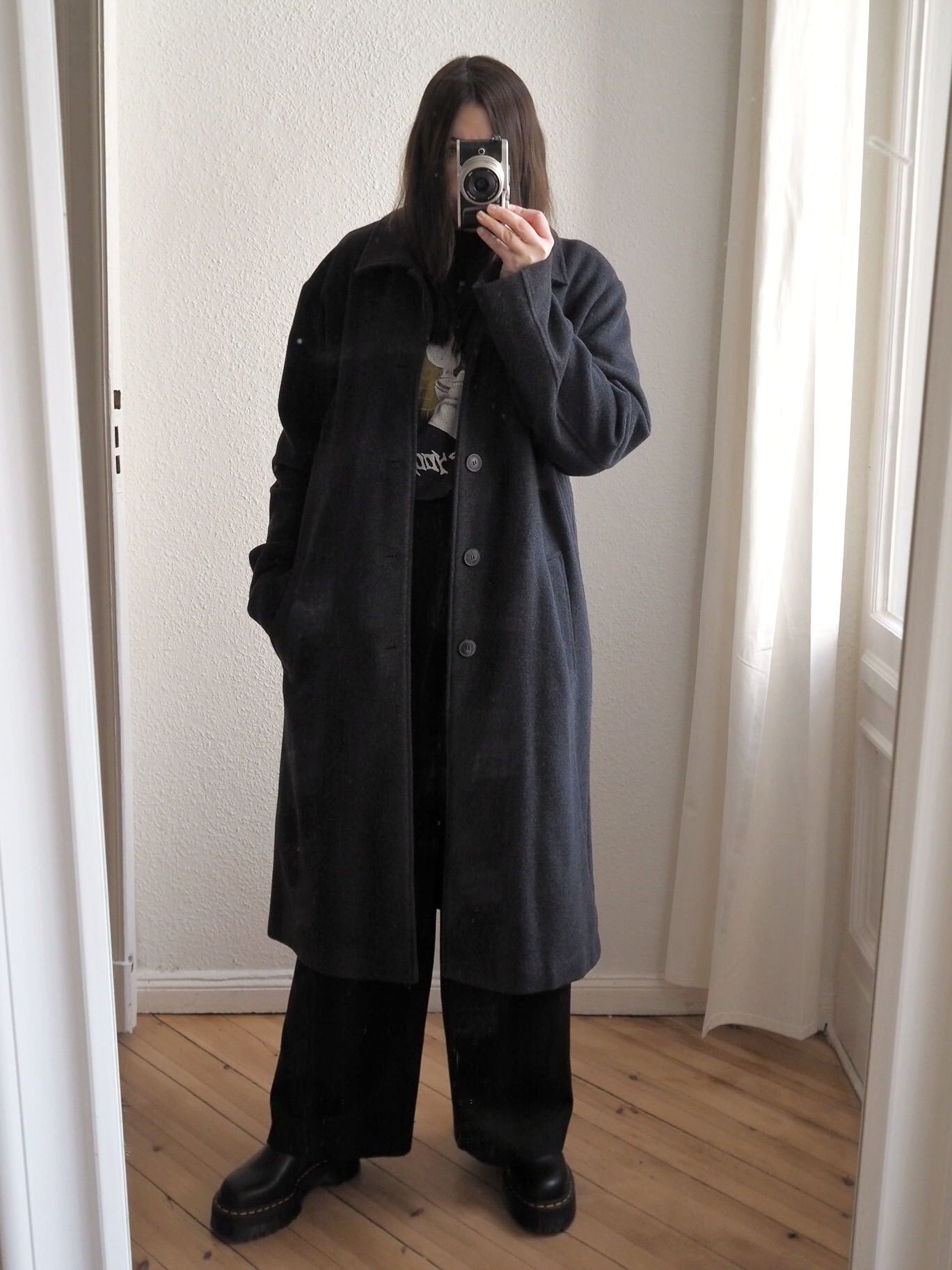 Mantel: American Vintage (Menswear), Hose: H&M Trend (alt), Schuhe Dr. Martens, T-Shirt: Metallica Bandshirt (alt)
