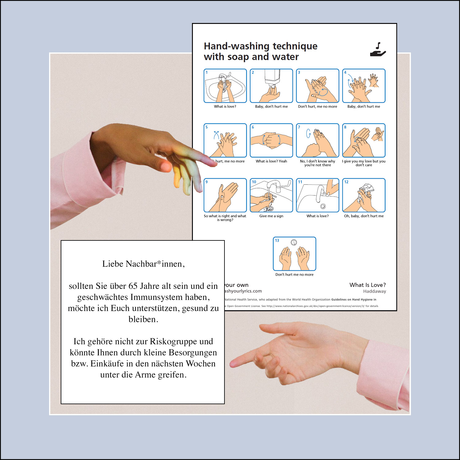 Wisst ihr natürlich alle und trotzdem folgt hier der Reminder: Wir sollten uns die Hände regelmäßig und gründlich waschen. Heißt: Die Hände mindestens 20-30 Sekunden lang mit Wasser und Seife waschen. Wie das nach WHO-Standard richtig funktioniert, seht ihr in diesem Video. Um die Zeit in etwa abschätzen zu können, könnt ihr euch euren passenden Hände-waschen-Song per Wash Your Lyrics zusammenstellen und anschließend als PDF herunterladen. Meistens werden übrigens die Daumen beim Waschen vergessen: Achtet mal drauf!