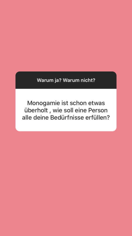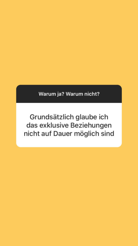 Ich finde es schade, dass wir Monogamie oder Exklusivität oft als Default-Modus ansehen und nicht als bewusste Entscheidung nach einem gemeinsamen Kommunikationsprozess, der zu Beginn der Beziehung oder schon davor stattfindet. Ich fühle mich in einer nicht-exklusiven Beziehung sicherer, da ich weiß, dass eine Verliebtheit nichts infrage stellt, bloß weil sie möglich ist.