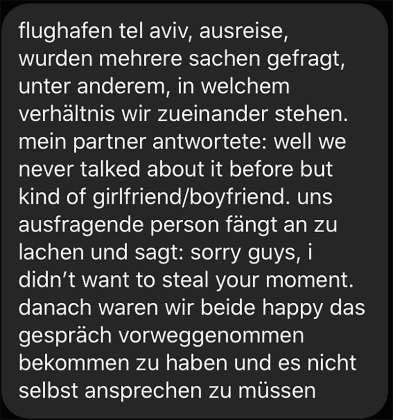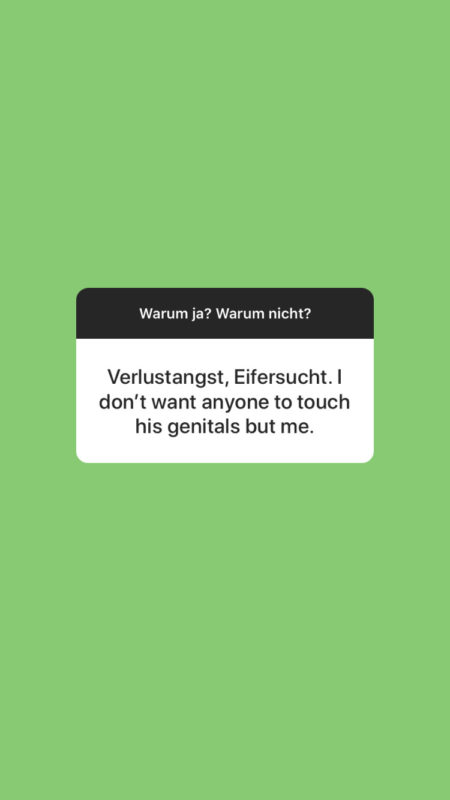 Ich weiß das erste Mal in meinem Leben nicht so richtig wie ich etwas sagen oder besprechen soll. Wir sind total verliebt, waren uns vor zwei Wochen aber noch einig, dass Monogamie irgendwie gerade eigentlich nichts für uns ist. Wir haben mit Freundinnen Scharade gespielt und saßen nebeneinander. An dem Tag wollte ich ihn meinen Freund*innen das erste Mal richtig vorstellen. Während des Spiels zeigte eine Freundin auf uns beide und sagte: „Ihr beide seid ein …“, woraufhin wir beide einstimmig „Paar“ sagten, obwohl wir das nicht einmal sind. Tatsächlich ging es aber eigentlich darum, dass wir beide Brillenträger*innen sind − wir haben die Paarfrage dann offengelassen und weitergespielt. Danach stand es auf jeden Fall im Raum und ich habe ihn dann später auch darauf angesprochen. Das lag aber auch an mir als Mensch, denn Kommunikation ist mir wichtig. Nach dieser Situation hat er jedenfalls gesagt, dass es für ihn inzwischen eine Perspektive sei. Bis heute haben wir aber noch nichts so richtig abgemacht oder beschlossen.