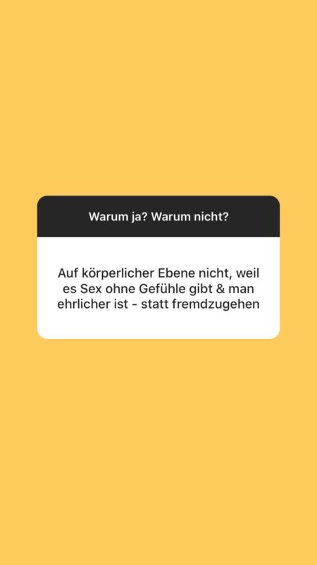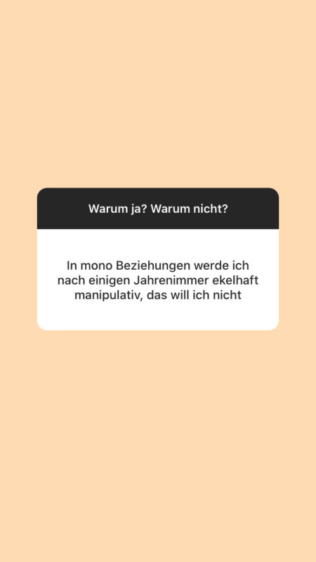 Warum nicht: Ich möchte von meinem*meiner Partner*in nicht verlangen, was ich von niemandem sonst verlange: alle meine Bedürfnisse zu erfüllen. Sich so gut zu kennen, dass man weiß, was man aneinander schätzt, wofür man sich liebt, aber auch, was man in anderen Menschen sehen kann, was einem der*die Partner*in nicht geben kann und soll und mit diesen Erkenntnissen letztlich ehrlich und sensibel umzugehen, ist für mich die schönste Erfahrung, die ich mit einem*einer Partner*in je machen durfte. Eine offene Beziehung ist für mich nicht die einfache, sondern die komplexeste Lösung. Sie kostet viel Zeit, Energie und Mut zur Kommunikation − und bringt Empathie, Miteinander und gemeinsame sowie alleinige Erfahrungswerte.