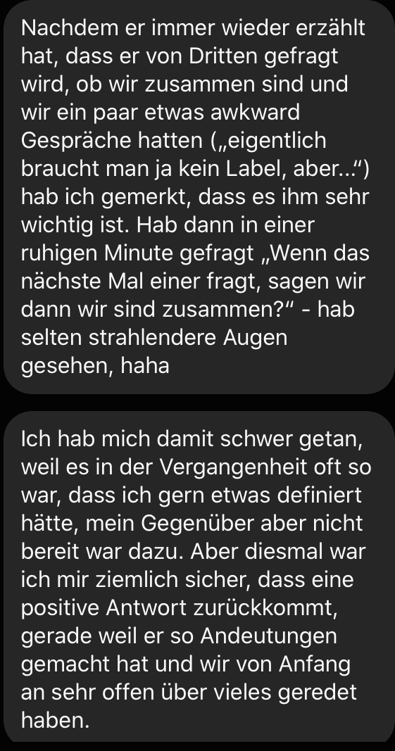 Ganz ehrlich? Ich bewundere alle Menschen, die diese Unterhaltung, diese Entscheidung nüchtern treffen können. Ich meine das ganz ernst. Man datet, ist sich nah, findet sich gut. Dann verliebt man sich und findet die andere Person besonders toll und will vielleicht mehr. Wenn es beiden so geht, sind die nächsten Wochen, abhängig von Nähe und Verhalten, doch ohnehin klar geregelt. Ob man noch weiter Sex mit anderen will oder nicht, sollte man besprechen, aber wann fragt man dann „Willst du mein*e Freund*in sein“, wenn es sich sowieso schon alles danach anfühlt? Ich habe sie damals betrunken gefragt, weil ich einerseits gegen die unangenehme Frage ankämpfte, andererseits aber doch eine Entscheidung wollte. Diese finale Bestätigung braucht man ja doch irgendwie, um … ja, warum eigentlich genau? Um endlich eine Antwort für die anderen zu haben? Ich selber brauche das Label eigentlich nicht, bin aber auch nicht so unabhängig, dass ich mich von der Außenerwartung freimachen kann. Da saßen wir also betrunken auf dem Heimweg von einer Geburtstagsfeier und ich hätte nicht gefragt, wäre ich mir ihrer Antwort nicht sicher gewesen. Vielleicht war es auch das, was diese Verhandlung im Nachhinein zu etwas so Unangenehmen machte.