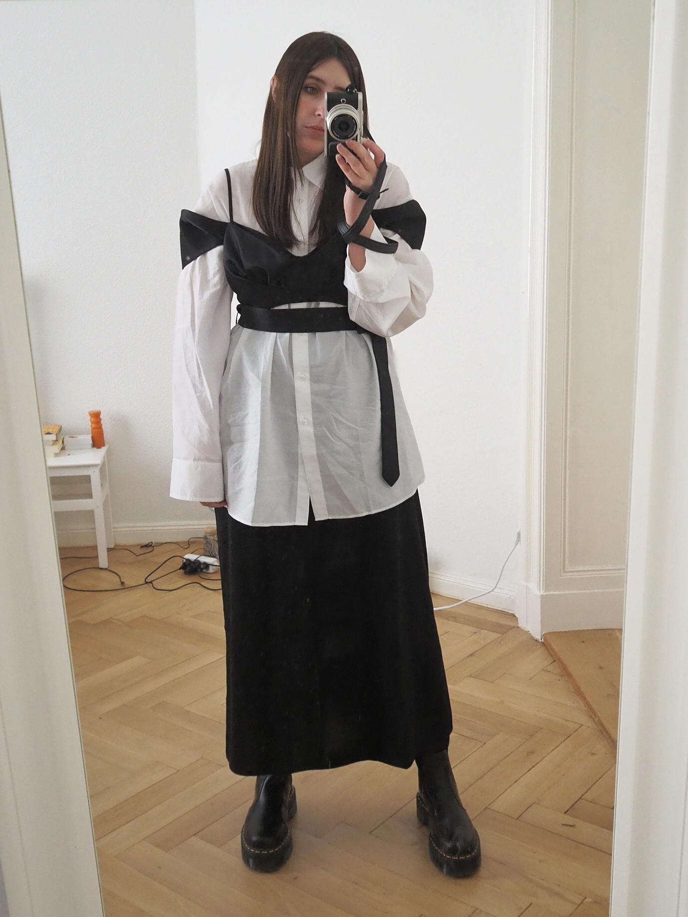 Hemd: Filippa K, Kleid: Raey, Bustier: Simone Rocha (älter), Schuhe: Dr. Martens