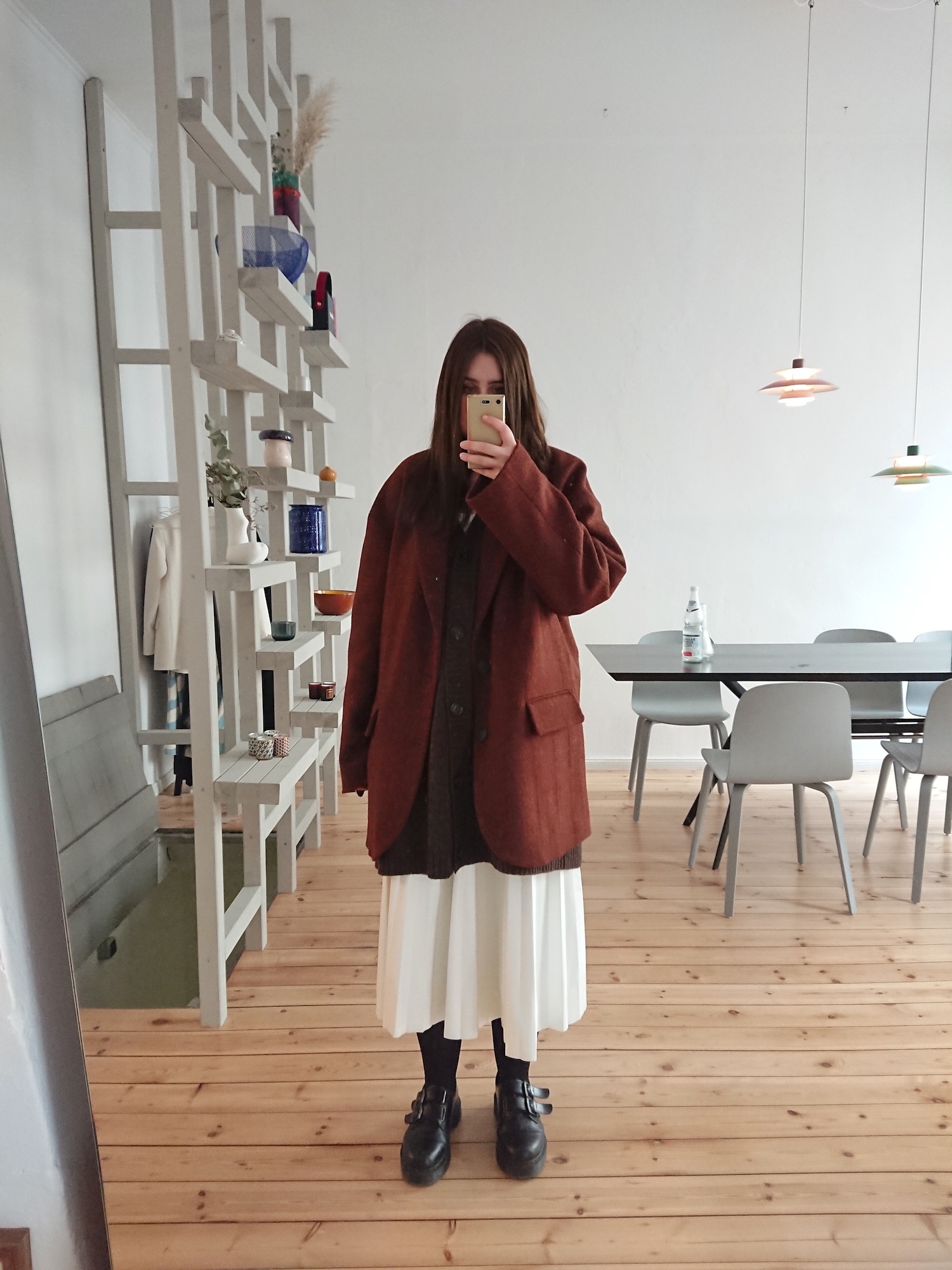 Das letzte Outfitfoto im Büro: Blazer: Raey, Cardigan: Acne Studios, Rock: MM6 Maison Margiela, Schuhe: Dr. Martens (älter)