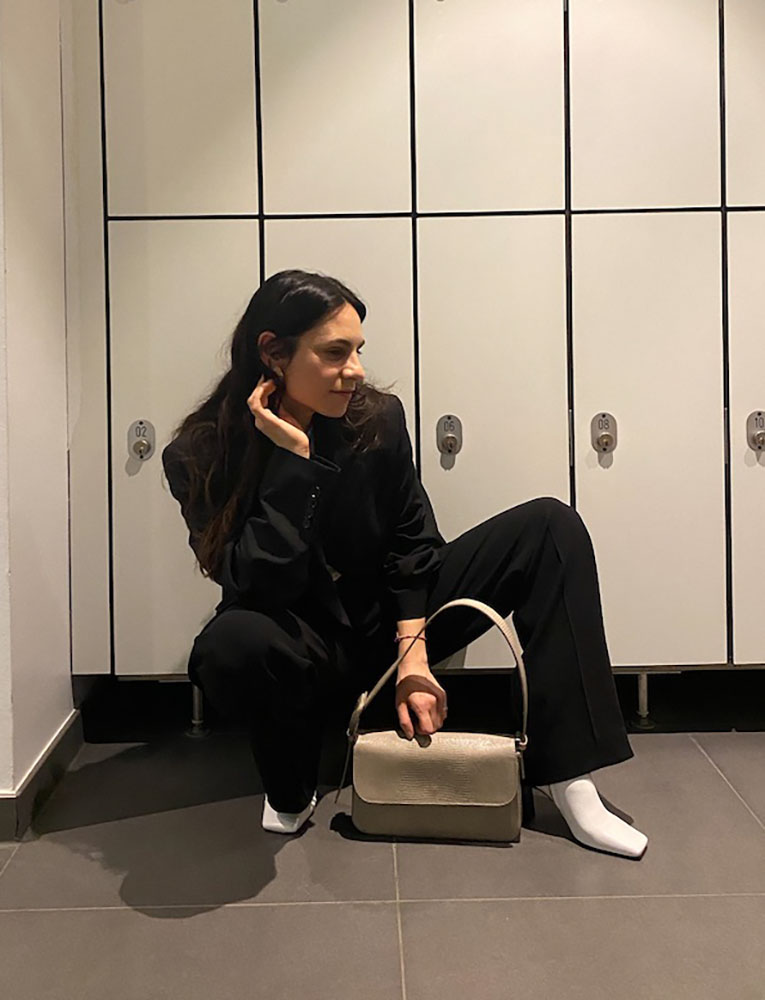 Anzug: Filippa K, T-Shirt: Carhartt WIP, Tasche: Arket, Stiefel: Wandler