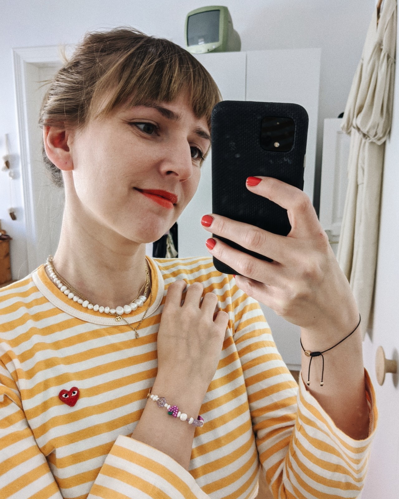 Shirt: Comme des Garçons Play, Kette: Wald Berlin, Armbänder: Hola Amor & Margova Jewellery, Lippenstift: Gucci (Agatha Orange)