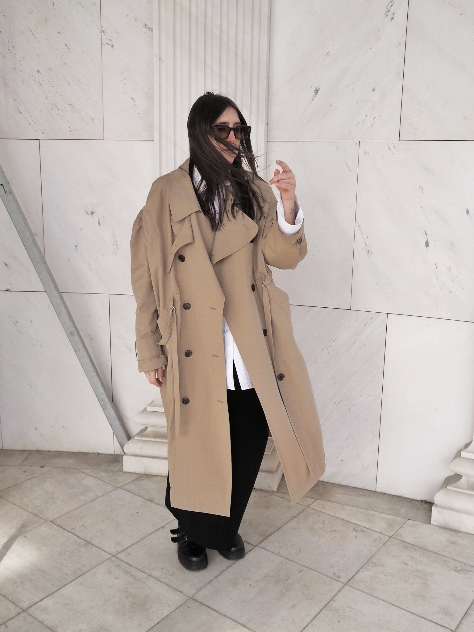 vor zwei Wochen trug ich: Trenchcoat: Pushbutton (älter), Hemd: Filippa K, Kleid: Raey, Schuhe: Dr. Martens (älter)