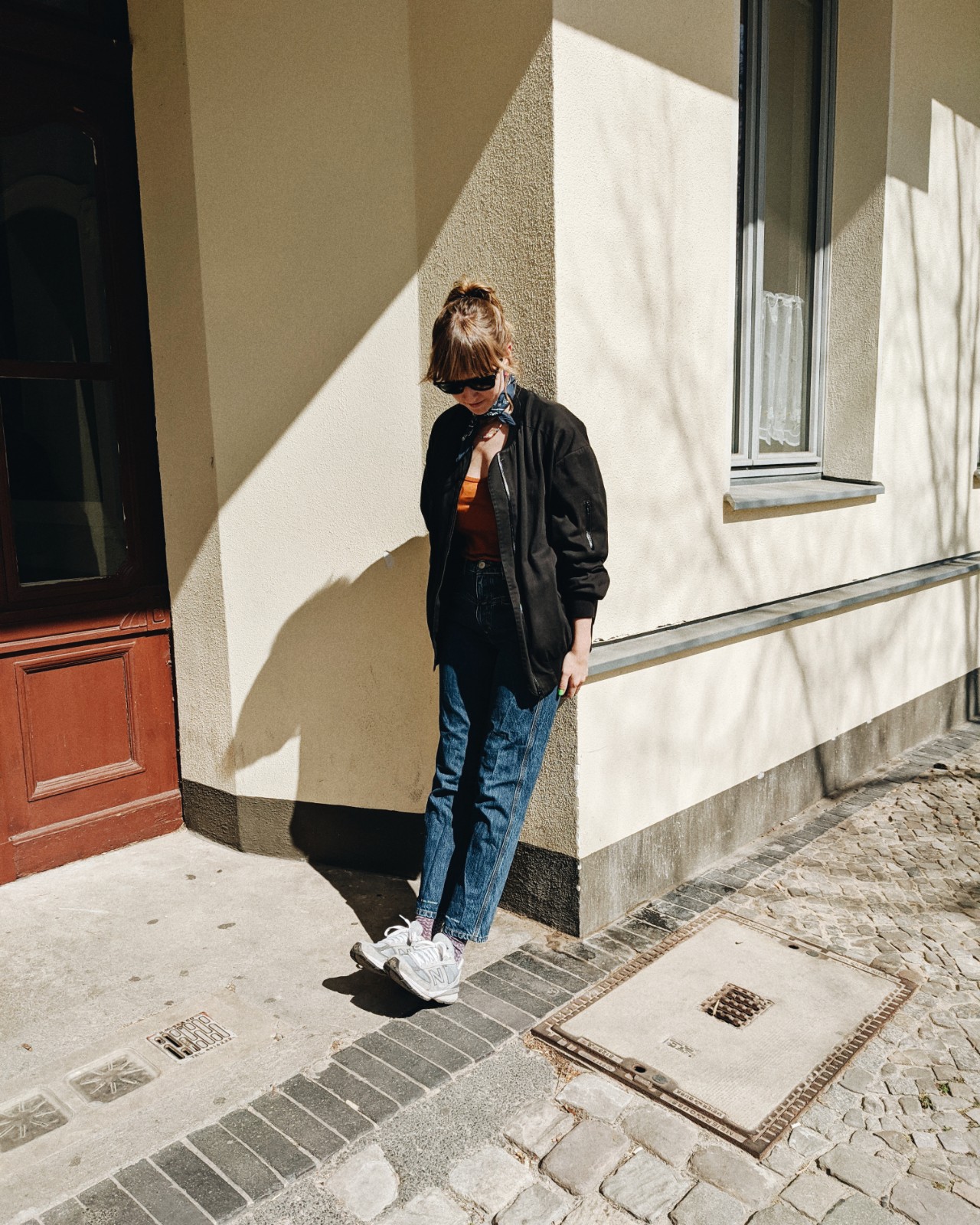 Bomberjacke: Weekday (alt), Shirt: & Other Stories (alt), Jeans: Closed (alt), Schuhe: New Balance, Halstuch: Levis