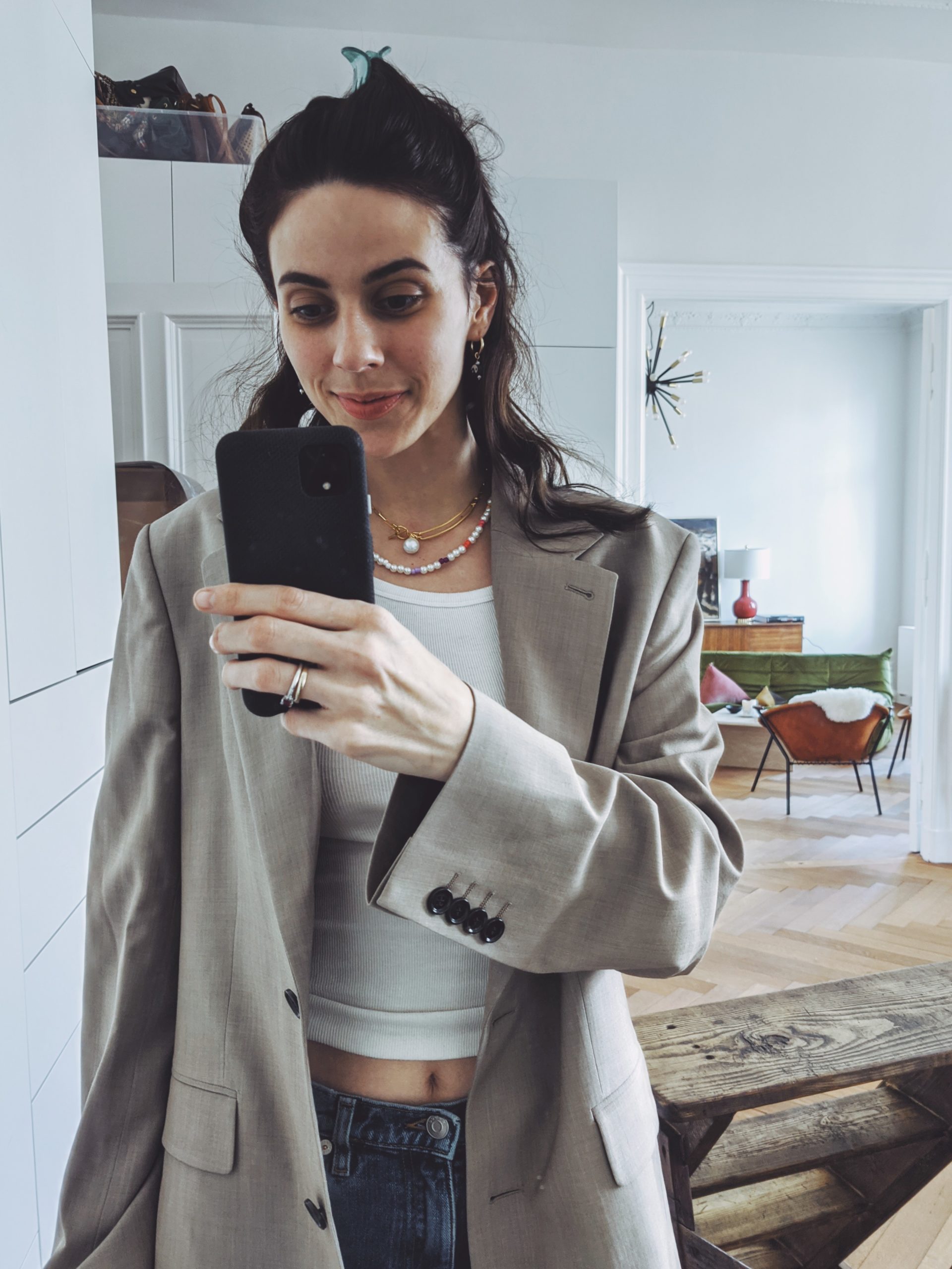 Top: & other stories, Blazer: Filippa K, Jeans: Arket, Kette: Jane Kønig