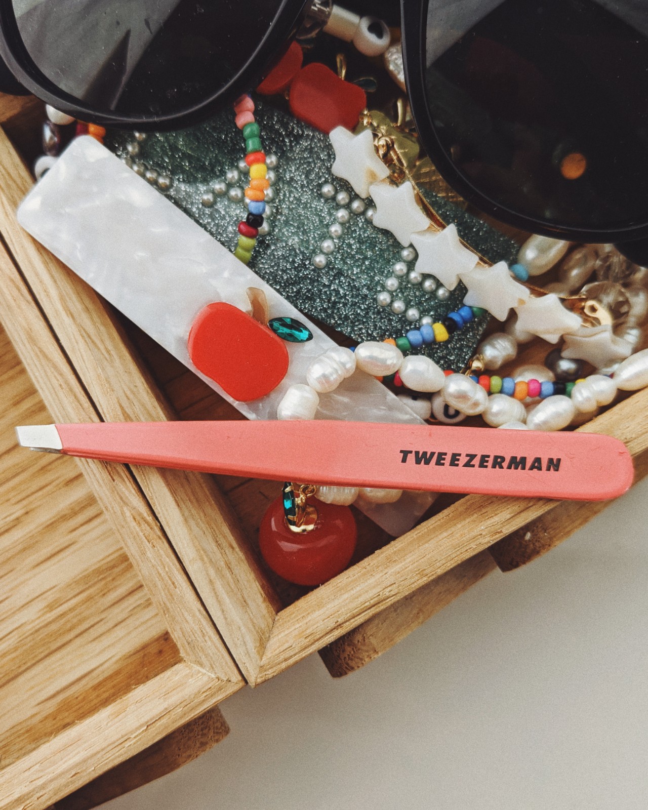 Schon klar, ich hätte einen wahrlich prickelnderen Beauty-Helfer für meine Top 3 auswählen können, aber hier geht es nun mal wirklich um meine absoluten Lieblinge aus dem Kosmetikschrank – und da darf die weltbeste Pinzette von Tweezerman einfach nicht fehlen. Sarah Radowitz weihte mich einst in das Geheimnis dieser kleinen Präzisionszange ein und seither bin ich wie ein Lux, damit mir dieses pinke Ding nicht abhanden kommt. Es ist nämlich so: Ohne Tweezi habe ich schwunglose Balken über meinen Augen. Ein bisschen nachzuhelfen und hier und dort zu zupfen, sorgt dank dieser Premium-Pinzette also für schnellen Schwung – fast ohne Ziepen.