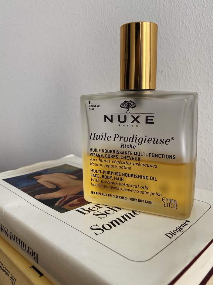 Dieses Öl ist seit über zehn Jahren fester Bestandteil meines Beautyrepertoires. Ich bin regelrecht vernarrt in das Nuxe Huile Prodigieuse, denn es pflegt die Haut so zart und geschmeidig. Dazu kommt natürlich der unwiderstehliche Geruch. Ich sage zum Spaß gerne, dass das mein Haut-Outfit ist, also der Geruch. Am liebsten trage ich das Öl auf die feuchte Haut auf und lasse es dann einziehen. Und es geht auch prima für die Haare. Hier muss man allerdings aufpassen, dass man nicht zu viel in die Haare gibt und sie fettig werden.