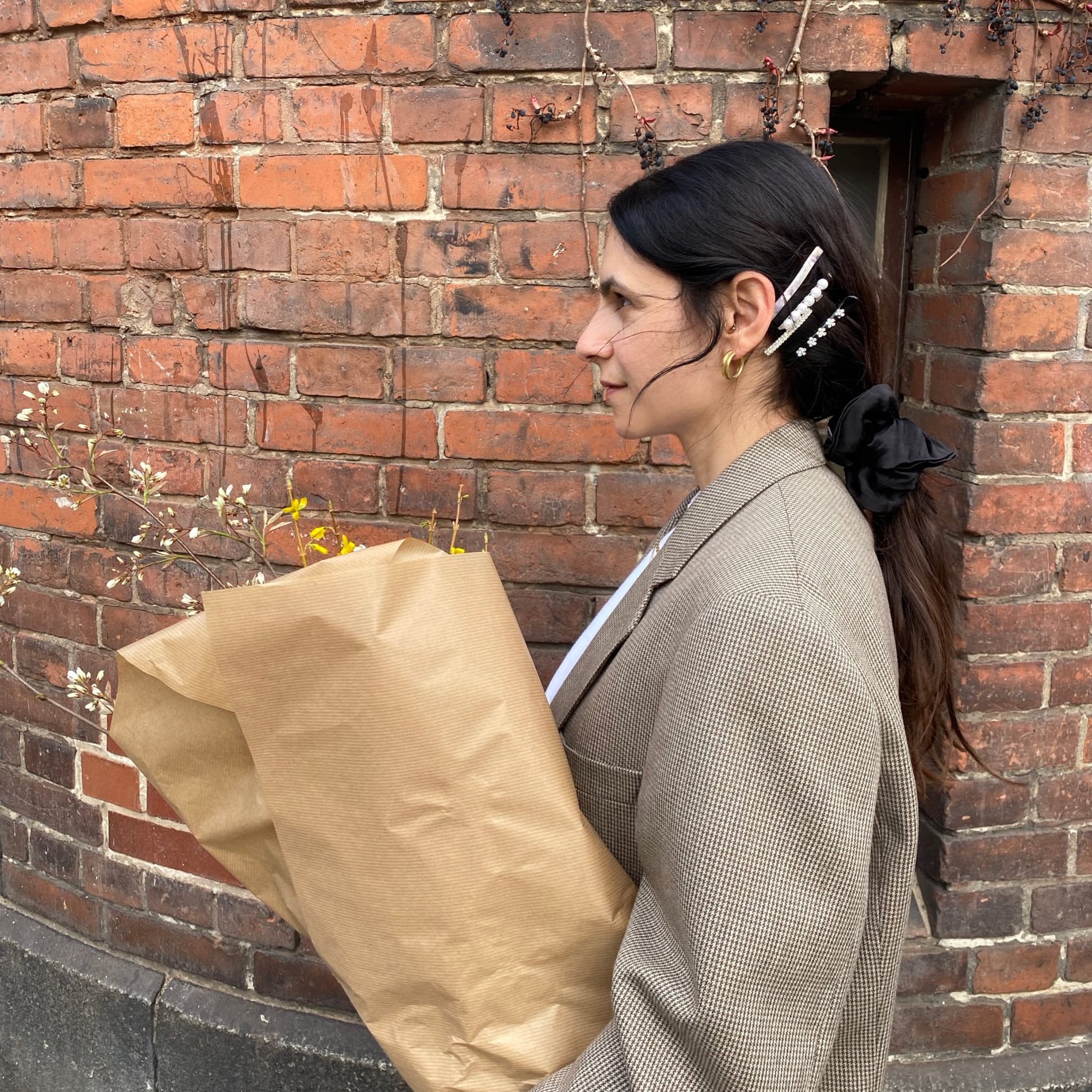 Genau wie bei den Haarspangen halte ich auch in Sachen Tücher stets die Augen offen. Über die Jahre habe ich mir so einen soliden Stock an Tüchern in unterschiedlichsten Größen angelegt. Die meisten habe ich auf Flohmärkten oder in Secondhandläden gekauft und genau dazu würde ich euch auch raten, wenn ihr auf der Suche nach schönen Seidentüchern seid. Was hier auf dem Bild vielleicht so aussieht, als wäre es auf die Schnelle hochgeknotet und könnte jede Sekunde rausrutschen, hält den ganzen Tag! Wie? Ganz einfach: Legt euch kleine, transparente oder, in meinen Fall, schwarze Haargummis an und fixiert damit die Haare so, wie es euch beliebt. Ich nehme sie gerne tief im Nacken zusammen und falte den Zopf in der Hälfte hoch. Wenn der Zopf fixiert ist, lockere ich die Haare am Oberkopf mit den Fingern, ziehe einzelne Strähnen raus (damit es mühelos aussieht) und knote ein kleineres Tuch darum, sodass das kleine Haargummi verschwindet. Wenn ihr zusätzlichen Halt wollt, könnt ihr eine Ladung Haarspray auf den Zopf geben, bevor ihr das Tuch in die Haare bindet.