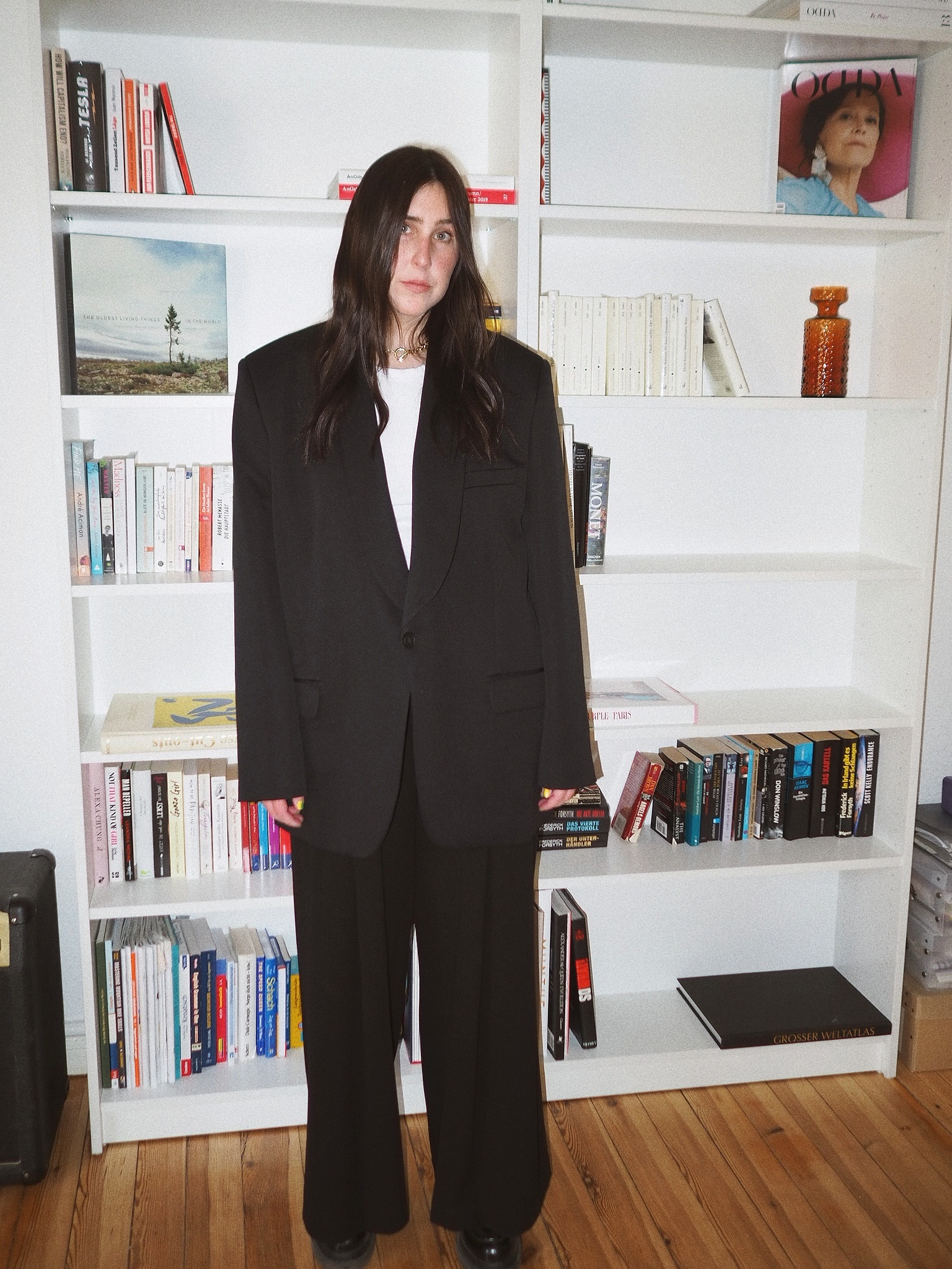 Blazer: Maison Margiela via The Outnet, Hose: MCQ by Alexander McQueen via The Outnet, geripptes Top: Weekday
