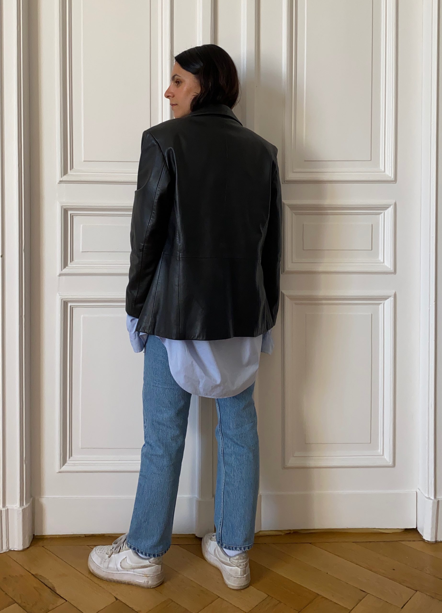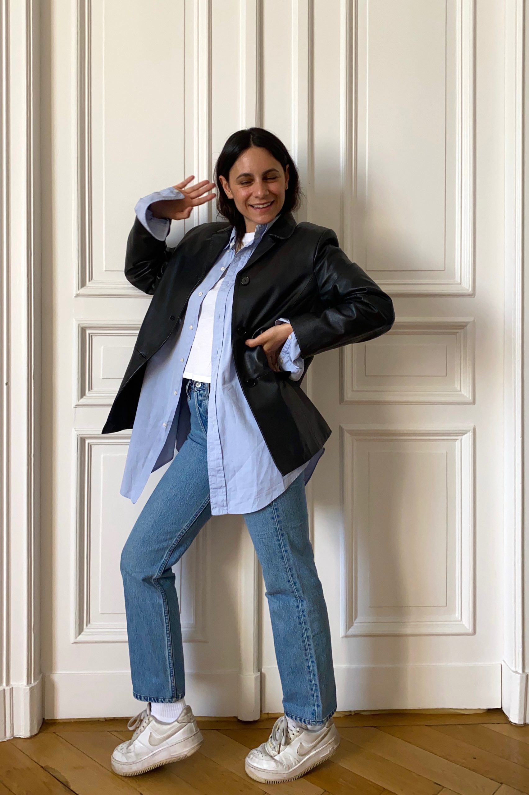 Lederblazer: Vintage ähnliche hier, Hemd: Ralph Lauren, T-Shirt: &otherstories, Jeans: Levi’s, Sneaker: Nike