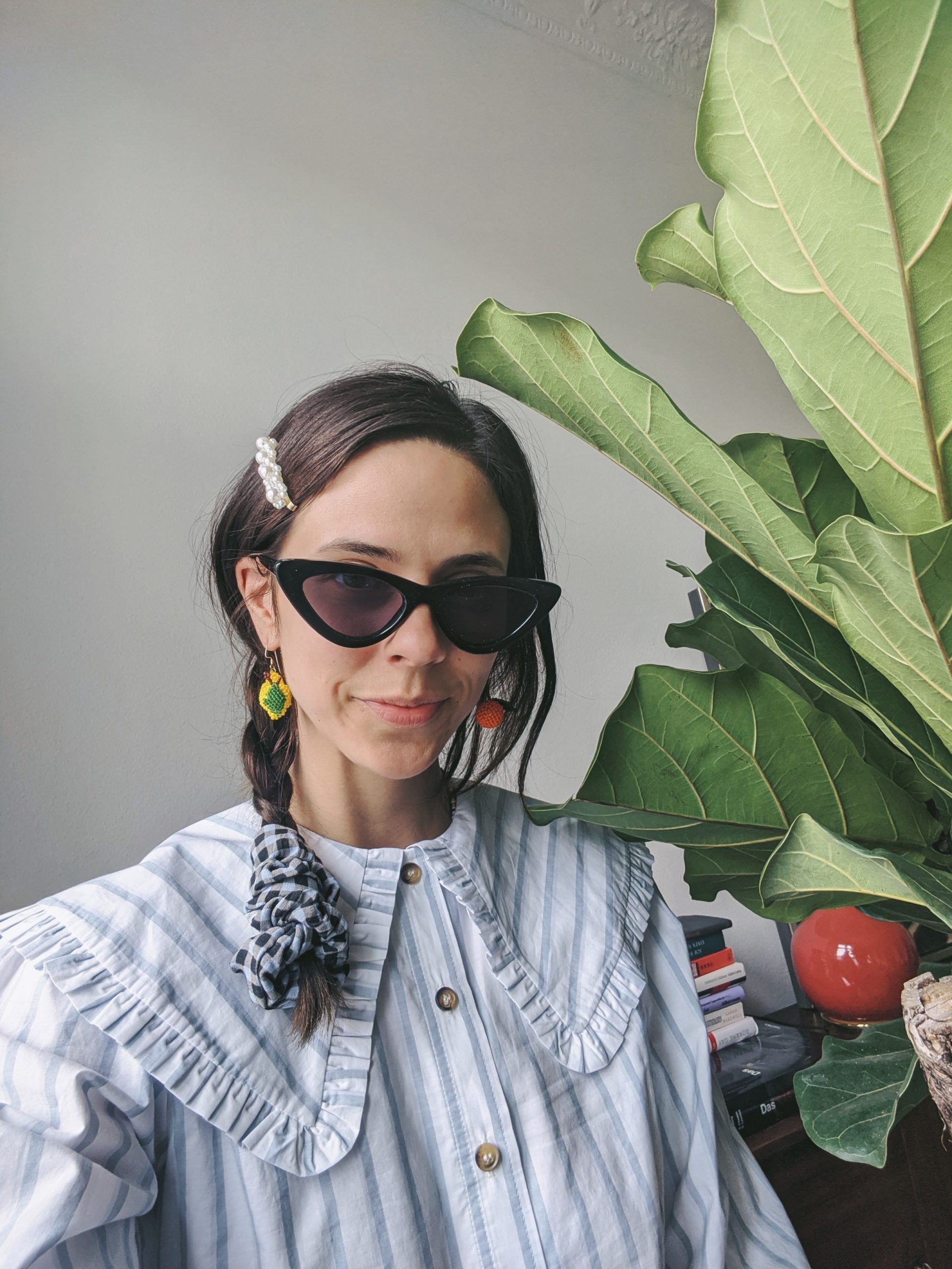 Sonnenbrille: Le Specs, Bluse: Ganni (auch hier), Haarspange: Simone Rocha