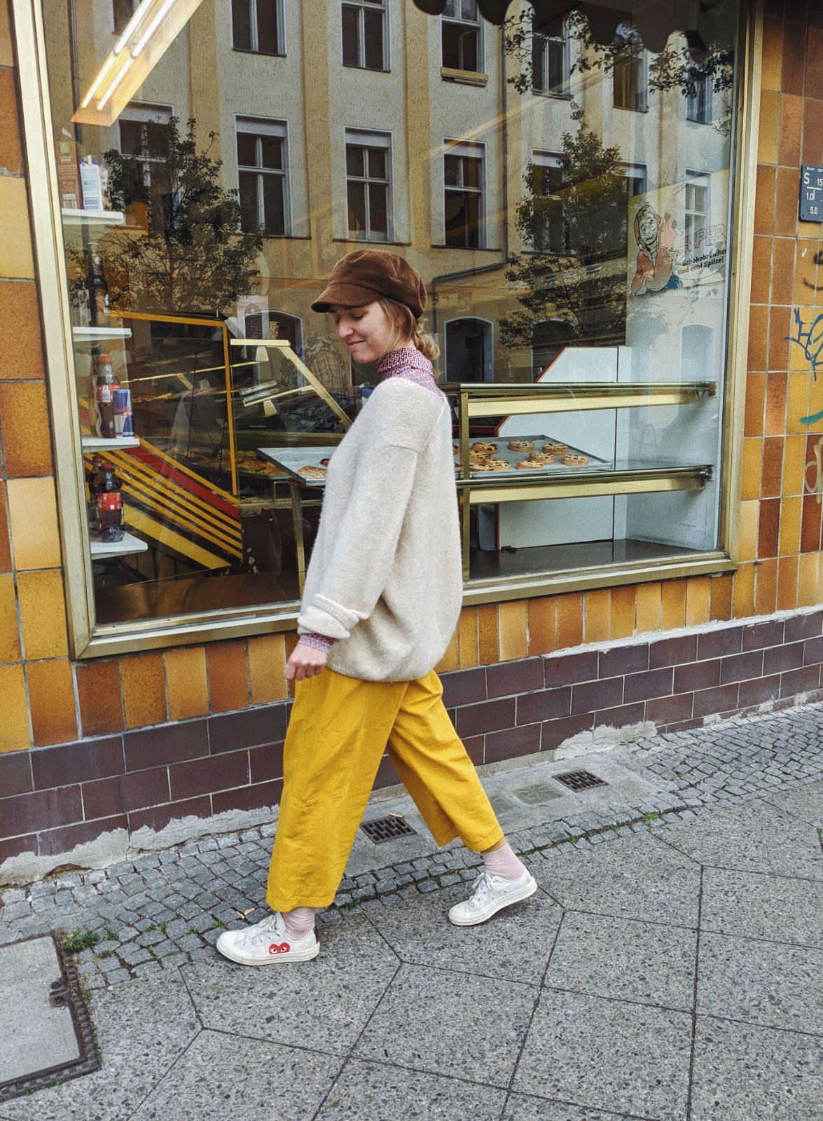 Schirmmütze: Prada, Longsleeve: Baum + Pferdgarten, Hose: Henrik Vibskov, Schuhe: Comme des Garçons Play, Socken: Hysteria by Happy Socks